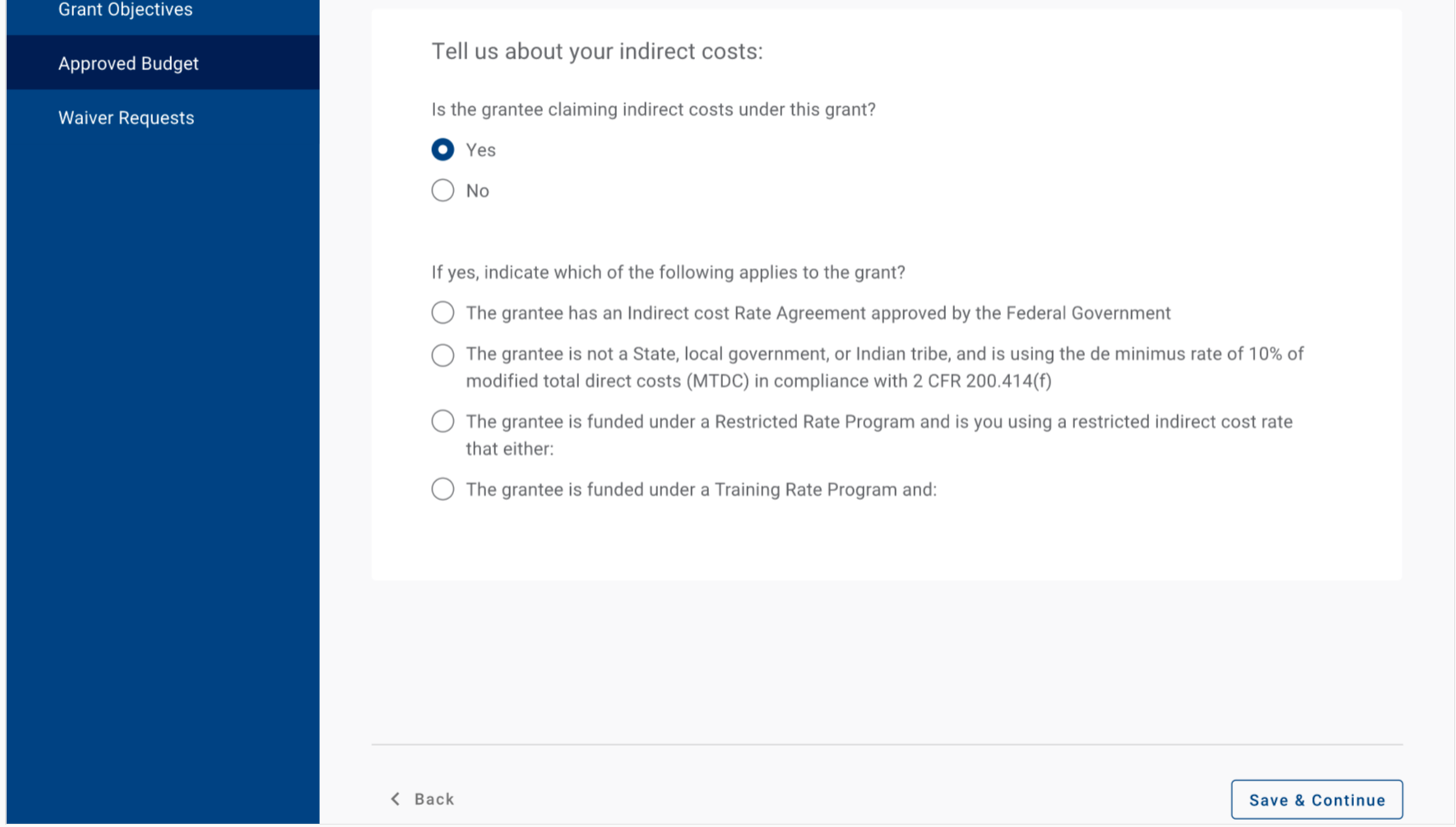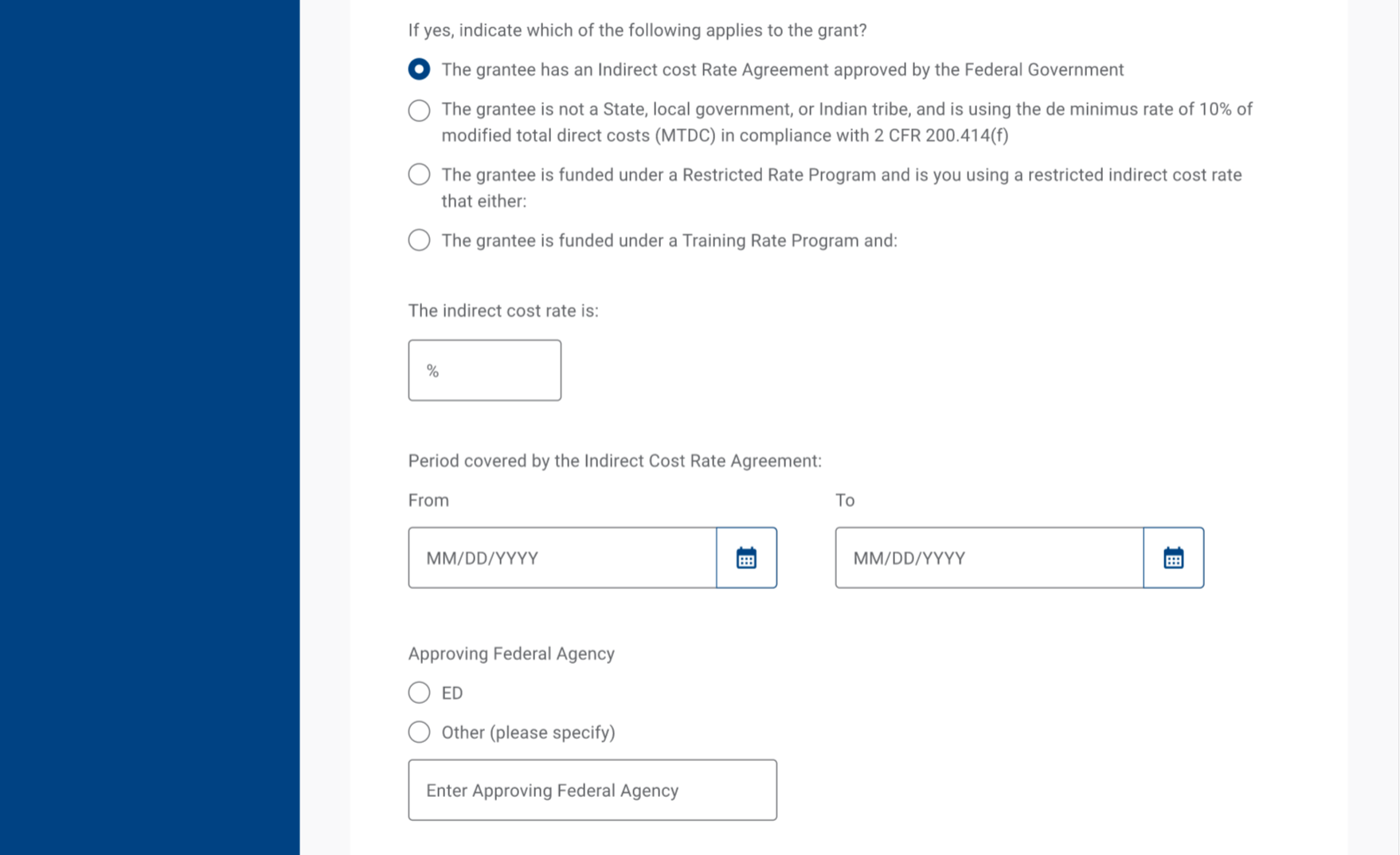 If Grantees select the first option, they are prompted to enter the indirect cost rate, dates the agreement covers, and then approving agency.