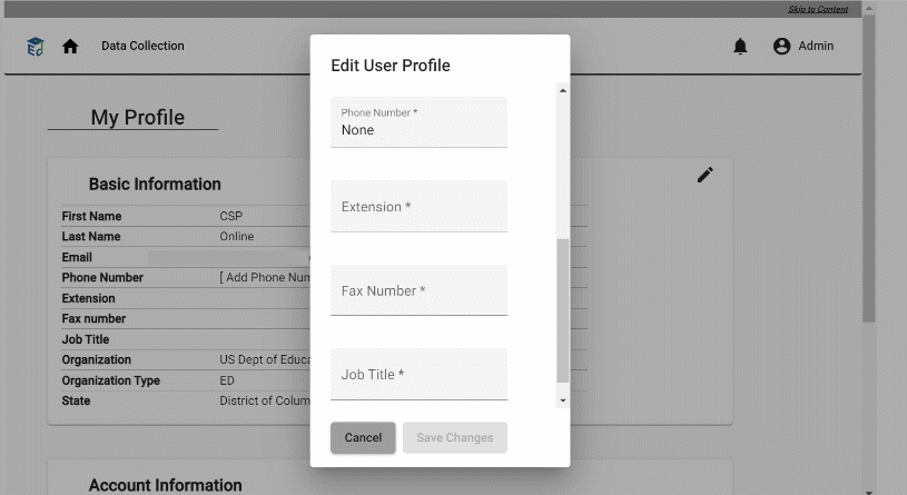 From there, Grantees can edit portions of their user profile such as their username, name, phone number and job title, as depicted below.
