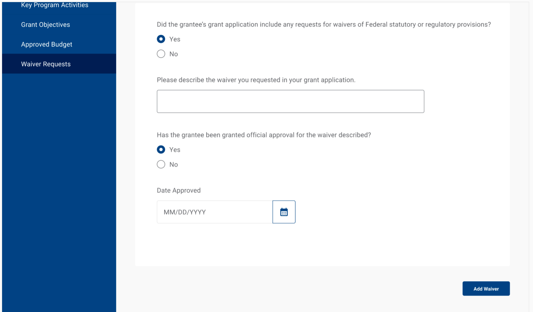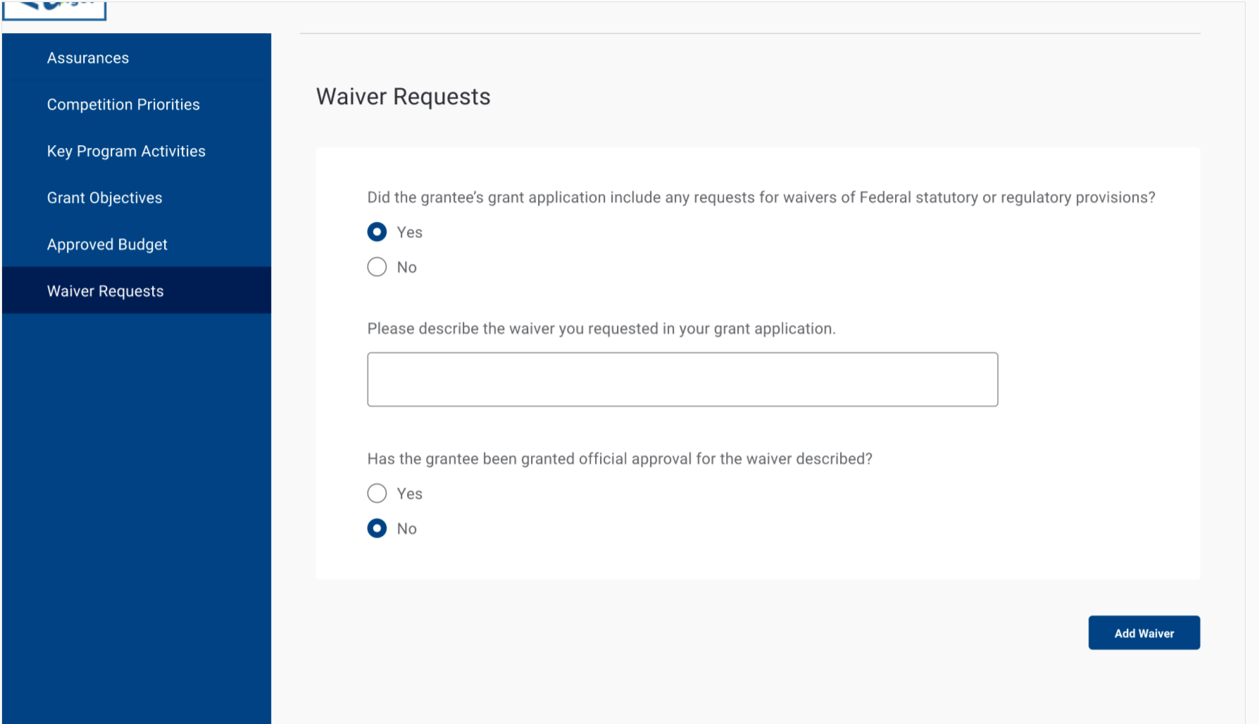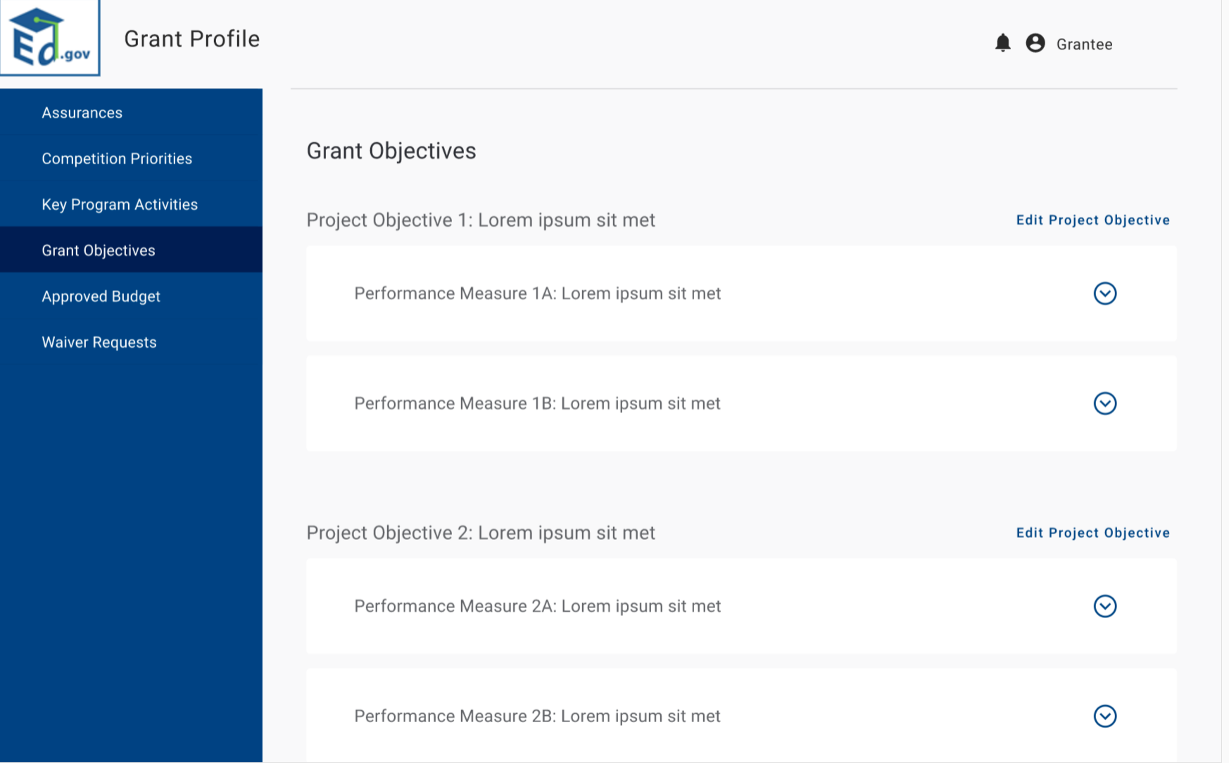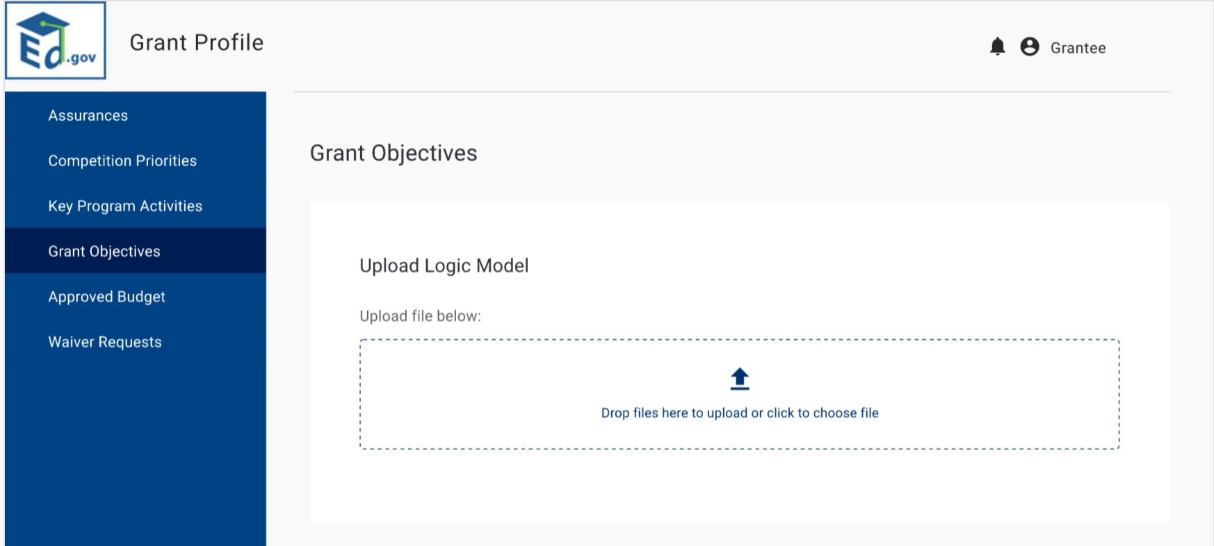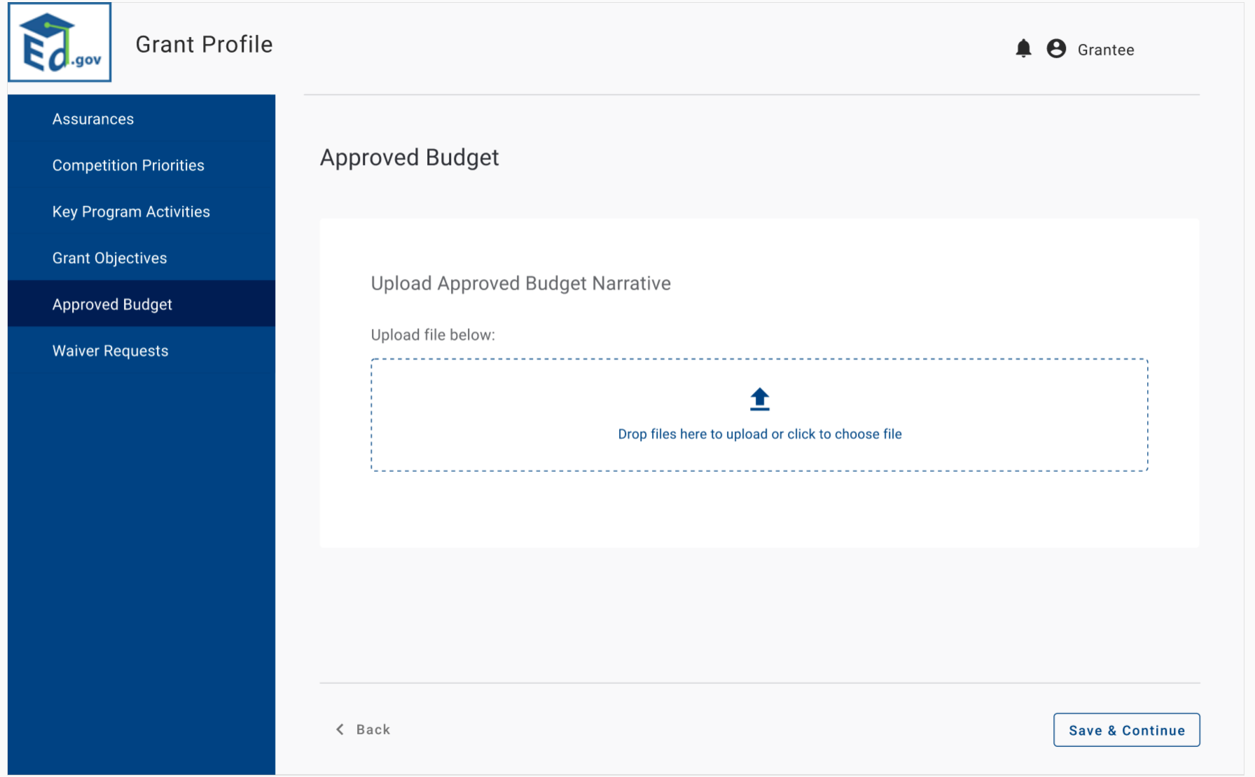 The Grant Profile is a module for DEV Grantees to enter baseline grantee organization and grant award information. This information is submitted by DEV Grantees once, at the beginning of the grant. Grantees are required to submit baseline information at the time of their award, such as assurances, competitive priorities, key program activities, grant objectives, approved budget and waiver requests.