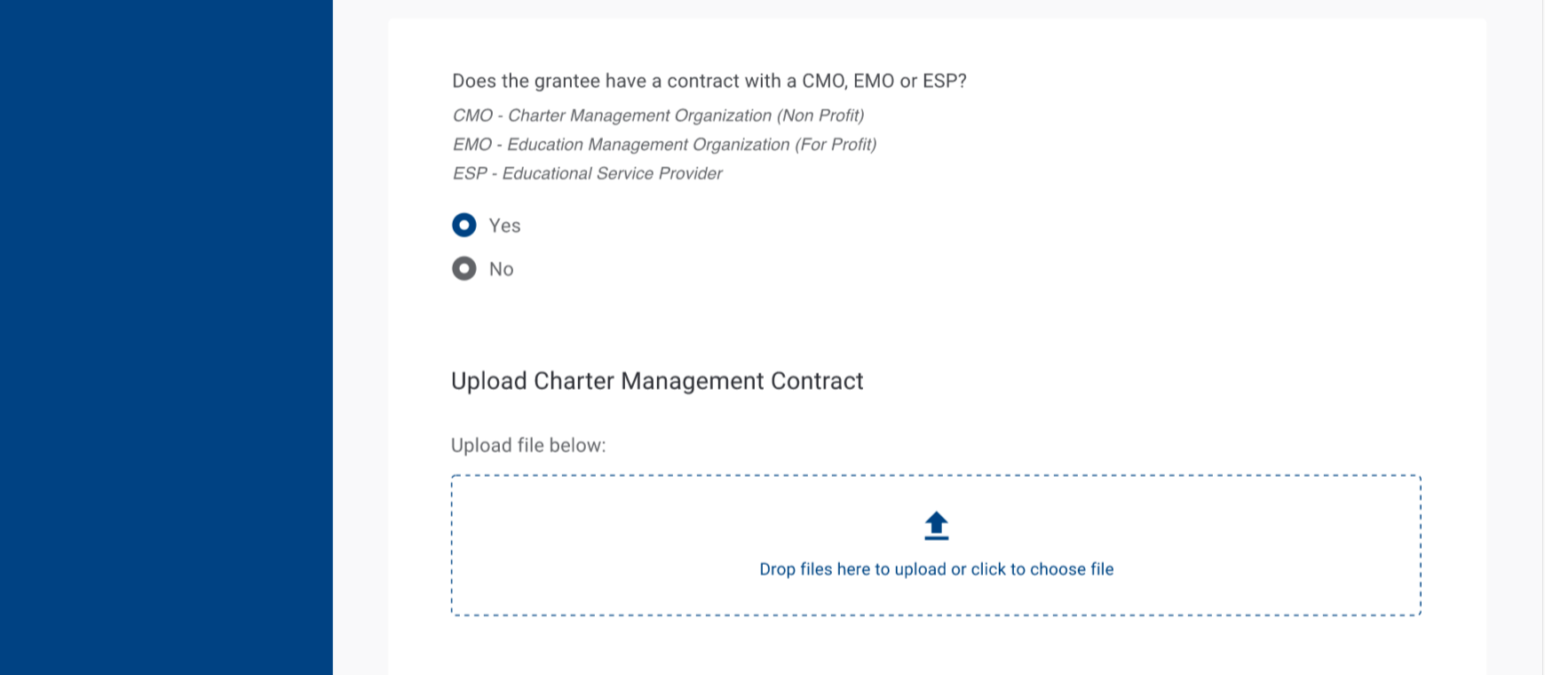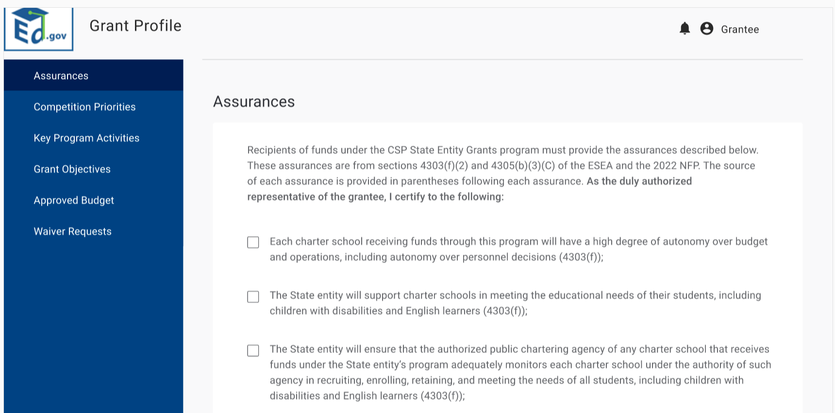 As CSP grant recipients, DEV Grantees have to follow certain Federal and U.S. Department of Education (ED) laws and regulations, as well as adhere to the project objectives and measures the grantee outlined in their grant applications, such as assurances, competitive priorities, key program activities, grant objectives, approved budget and waiver requests. As part of this requirement, CSP is requiring the Grantees enter key grant and project information at the time of award. This baseline information will be input once, and used to benchmark additional data/reporting that is required each Spring and fall as part of the APR and school/subgrant data collection requirements.