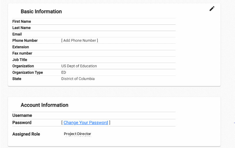 Grantees will be able to click on their user profile to review their basic information, as depicted below.