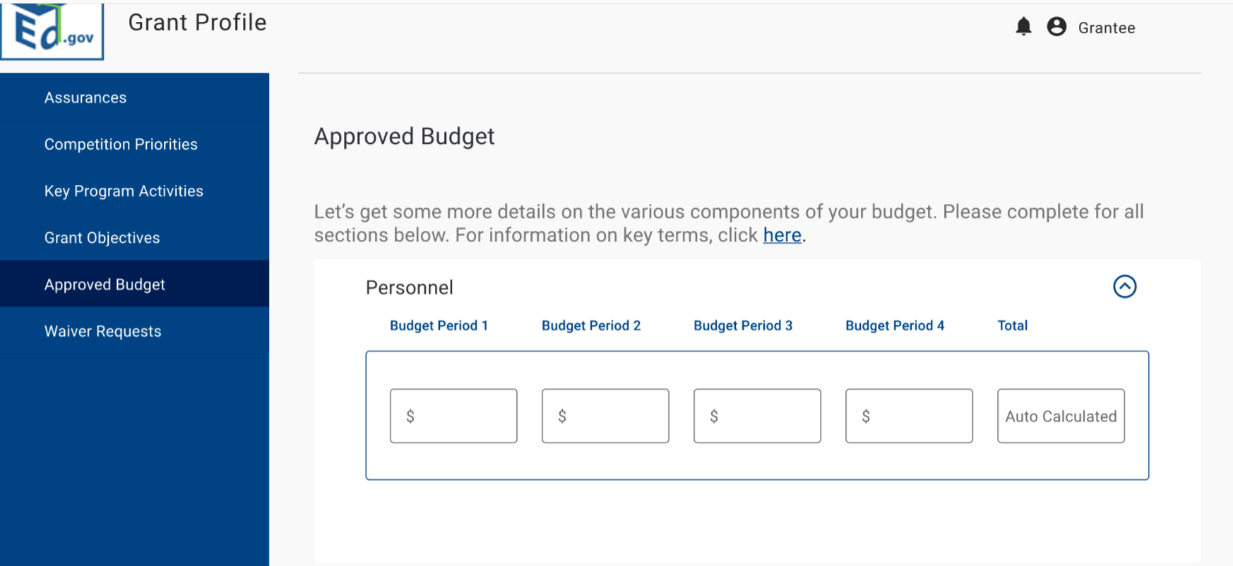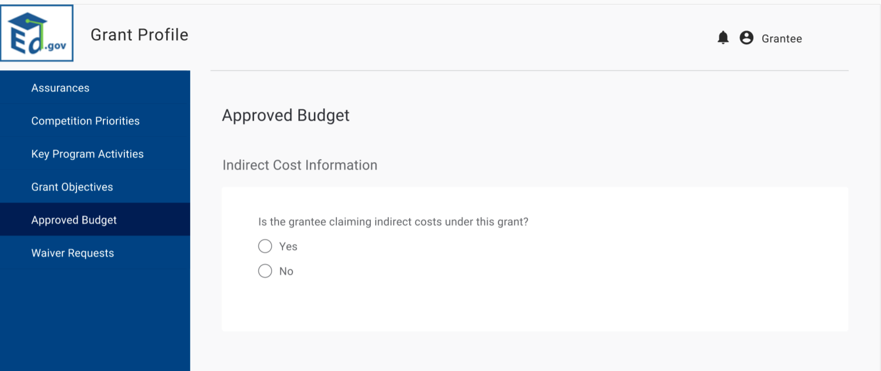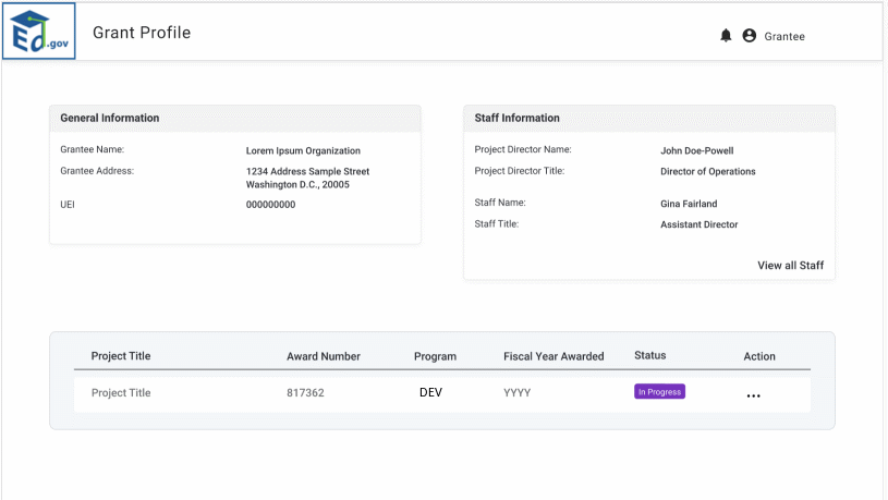 For a new grant award, ED will enter key information for a Grantee into their Grant Profile and activate the Grantee’s profile.