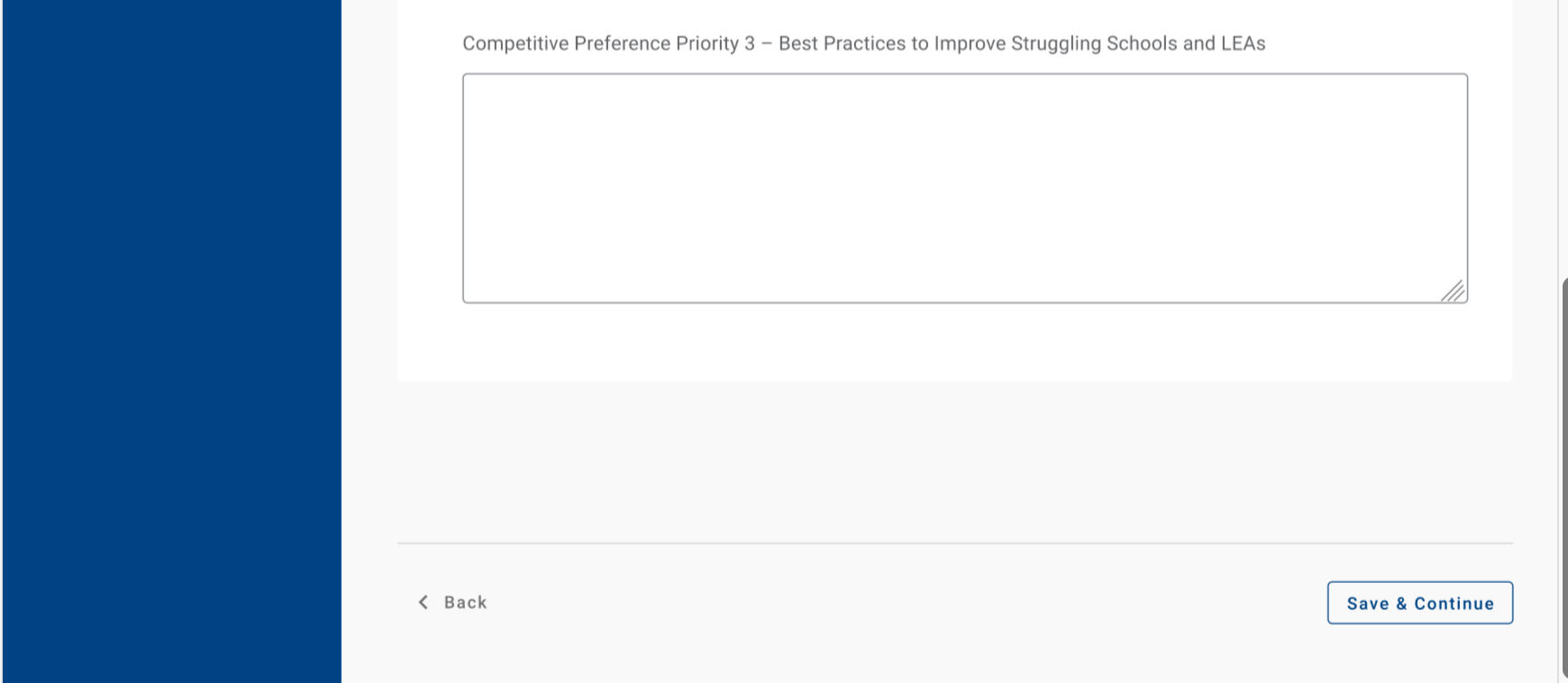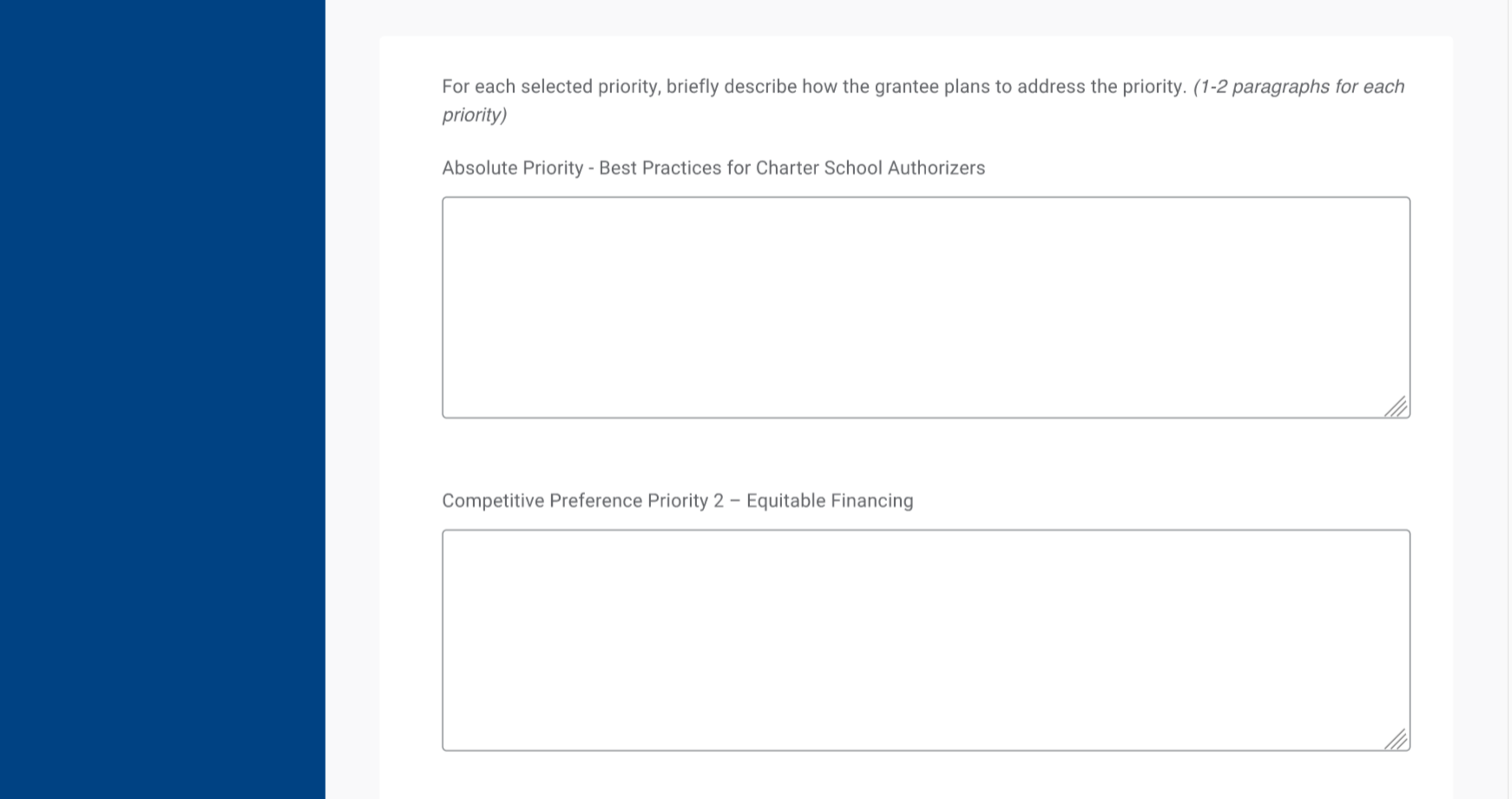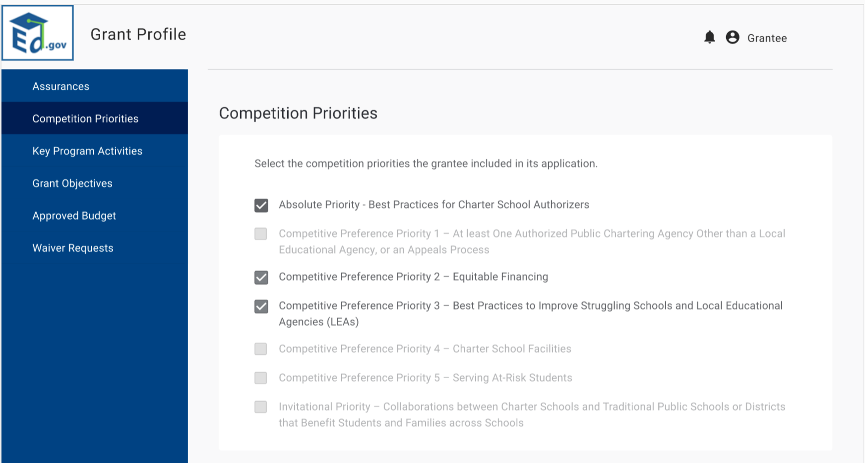 Please note that the text in the screenshots to the right is illustrative. Competition priorities will be created in the Grant Profile by ED, and the priorities depend on the grantee’s cohort.