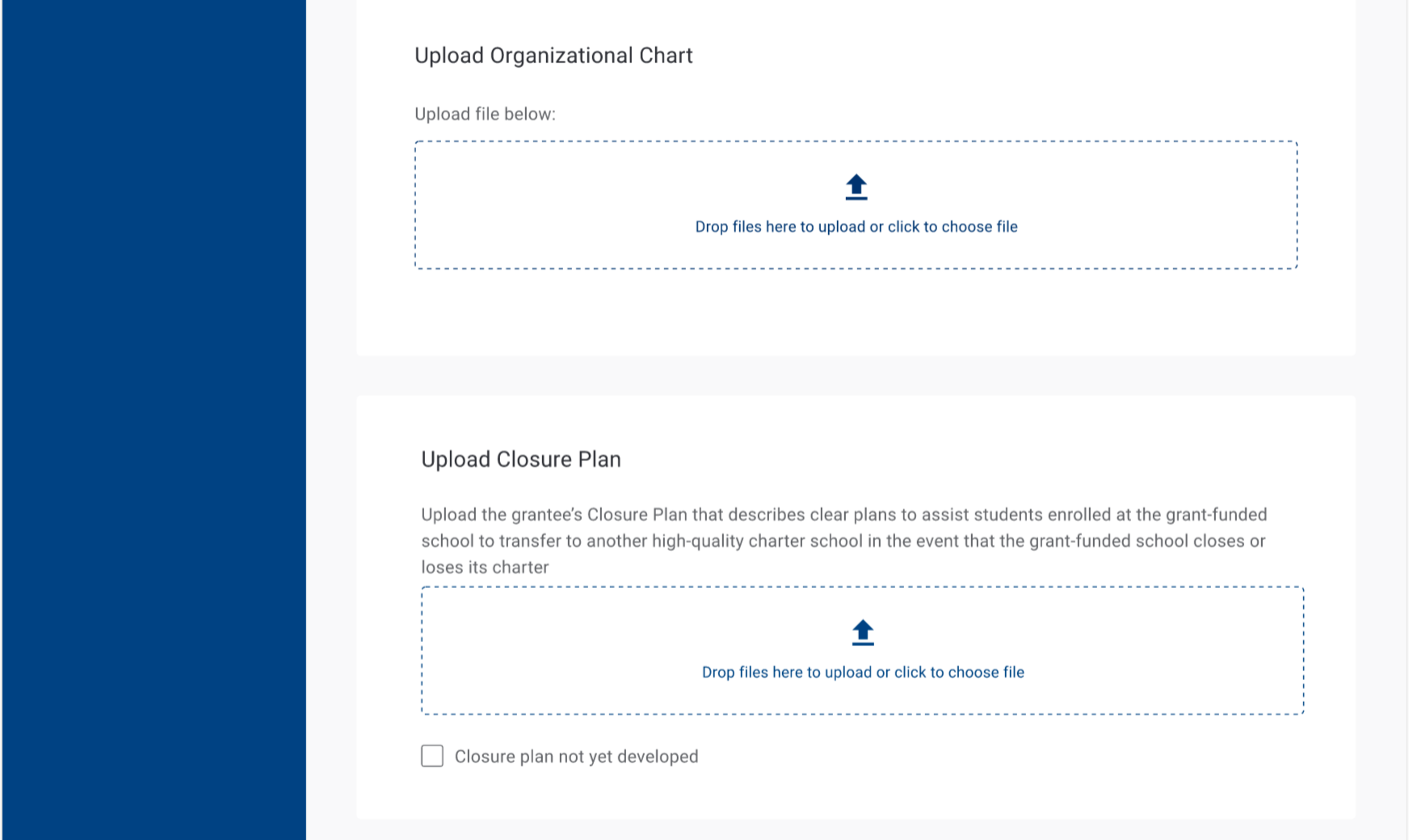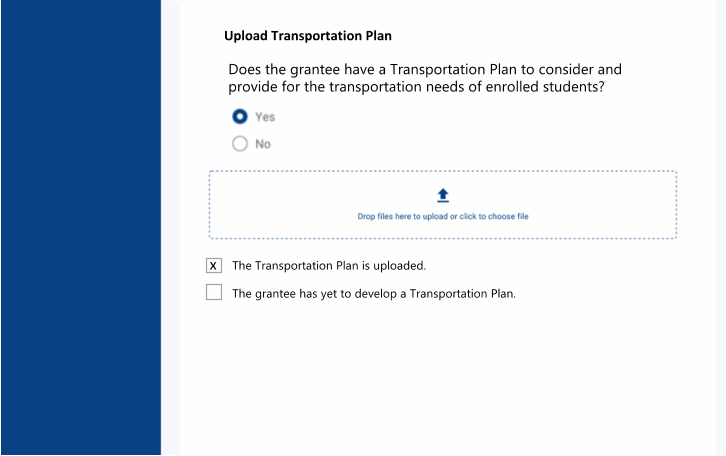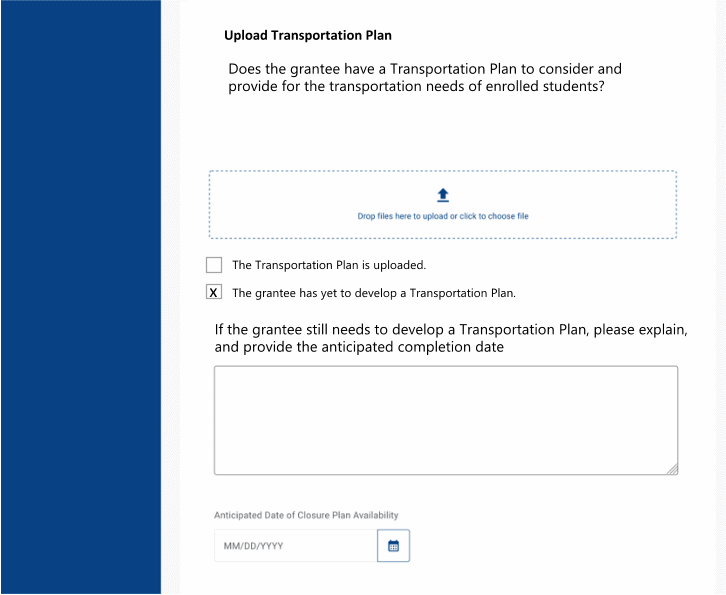 Underneath the closure plan, Grantees will upload their transportation plan.