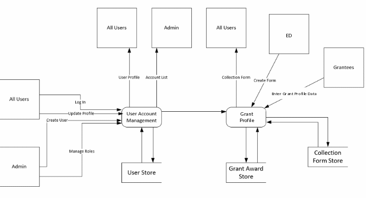 The User Access and Management module allows access, through an authentication process, to the system’s landing page for approved users. The system will provide a central web portal that delivers information, based on role, to DEV organizations. The portal permits users to see only the information that is appropriate for their roles. For example, a Grantee project director would only be able to see data collection information regarding their grant. Users are able to navigate to a user access management page that allows them to edit their name and email address and change their password.