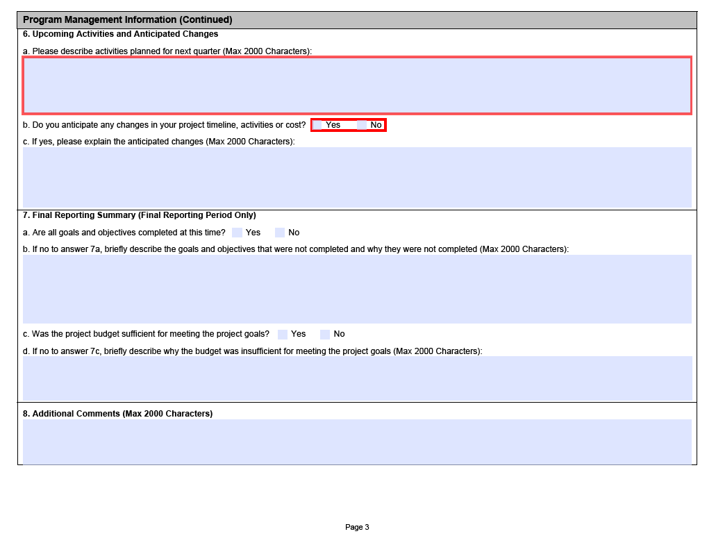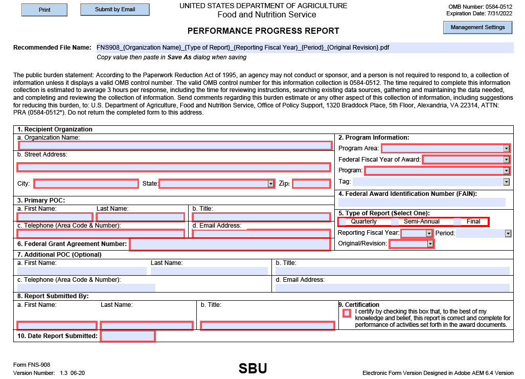 The following pages contain screenshots of the PPR form that grantees are required to use for progress and final reports submitted to FNS. Upon award, a PPR form (Adobe PDF), customized for the specific FNS program, will be included in award packages.