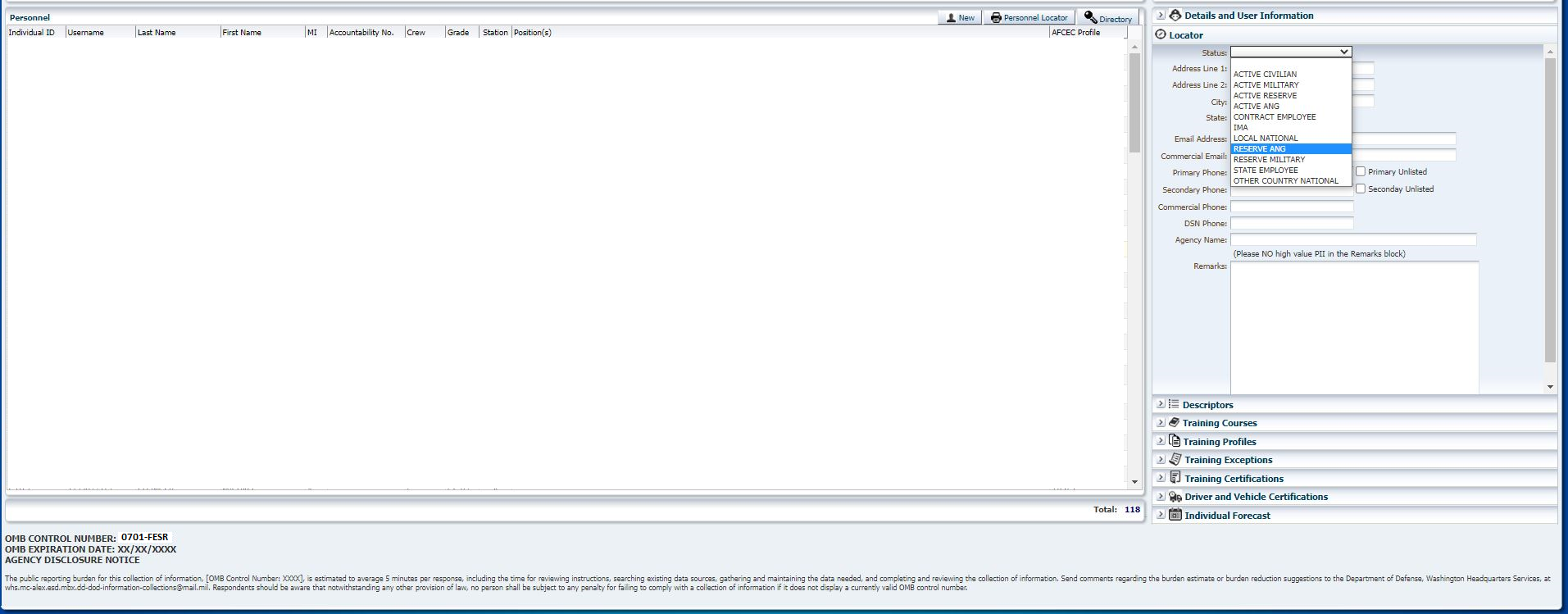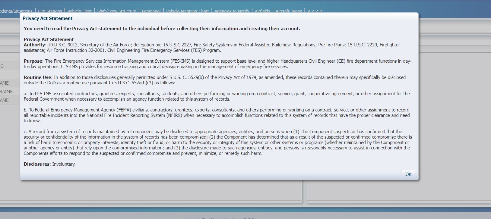 The interview then begins with the respondent (CE Firefighter personnel) providing answers to the following list of questions (26) to support account creation. The questions below correspond to fields in the FES-IMS screenshots (9 total) accompanying this package. This script is developed to assist with review and approval of the collection process detailed in the FES-IMS IC/PRA package.