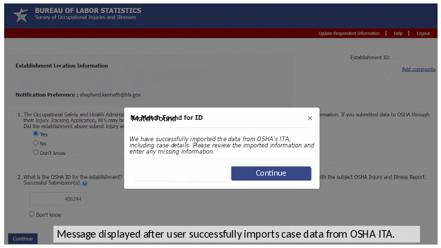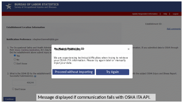 New pop-up messaging is added to the screen on which a respondent is asked to enter their OSHA ID that is used to match the SOII establishment to import data reported to OSHA ITA. The following two new messages are being added to inform respondents when (a) a match is found in OSHA ITA and data are imported or (b) when technical difficulties occur and data could not be imported.
