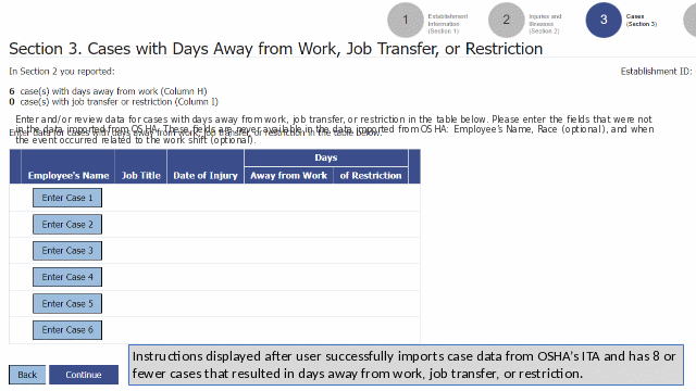 Instructions in Section 3 (Cases with Days Away From Work, Job Transfer, or Restriction) are updated to instruct respondents reporting 8 or fewer cases to review the case details imported from OSHA ITA and to enter information not imported from OSHA (i.e., OSHA excluded some case information in their collection and BLS collects some elements not included in OSHA collection, that respondents must add).