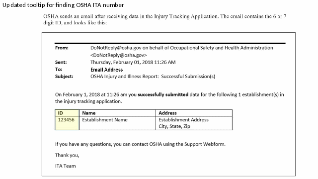The existing Tooltip that aids respondents in identifying their OSHA ID (assigned when reporting to OSHA ITA) is updated minimally to reflect this may now be a 6- or 7-digit number; previously OSHA IDs were limited to 6-digits but have been expanded by OSHA.