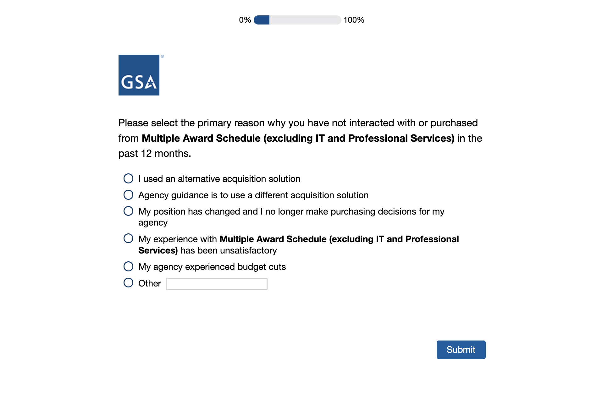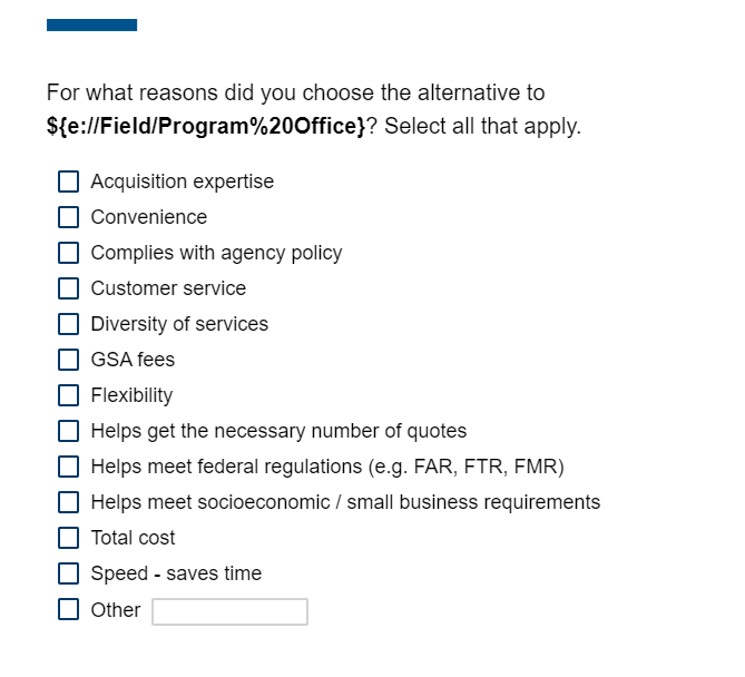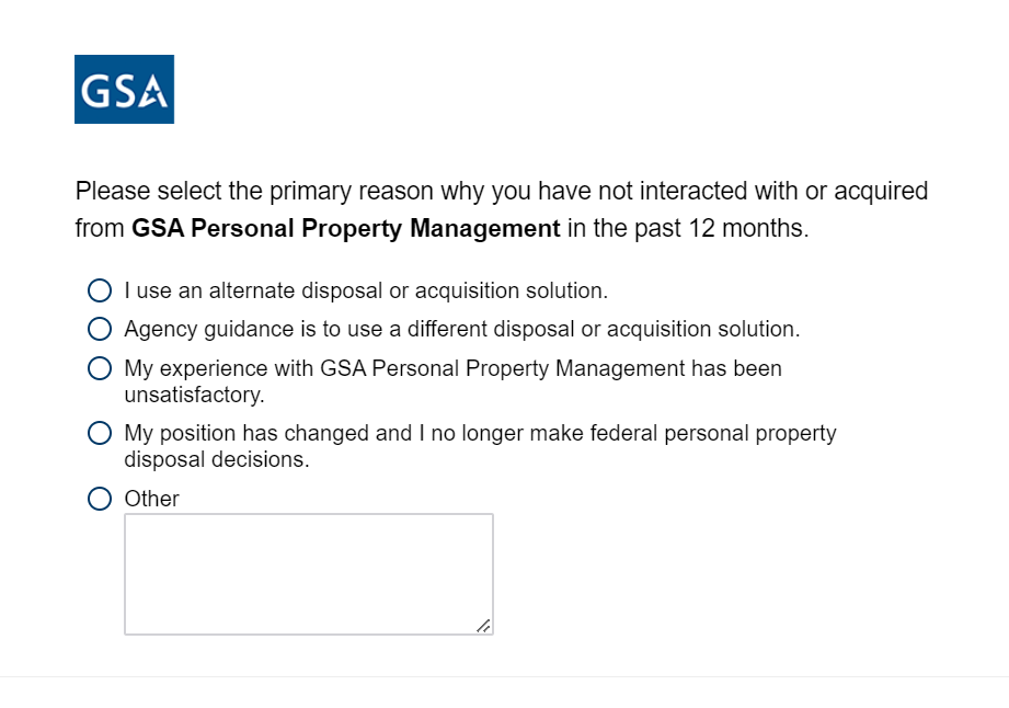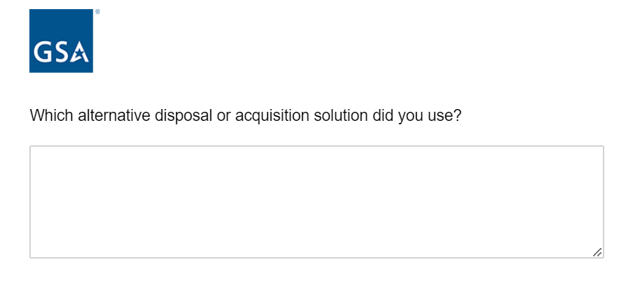 If responses above is ‘I used an alternate disposal or acquisition solution’ or ‘Agency guidance is to use a different disposal or acquisition solution,’ following question appears in same page