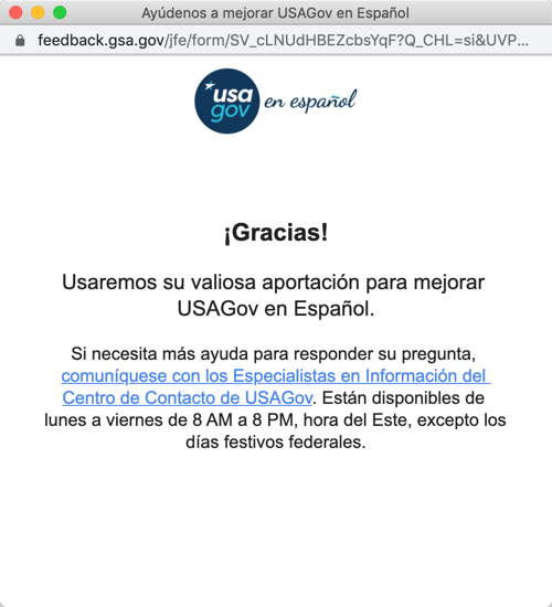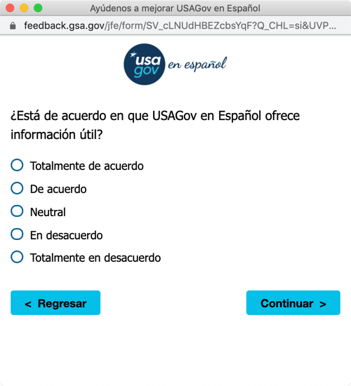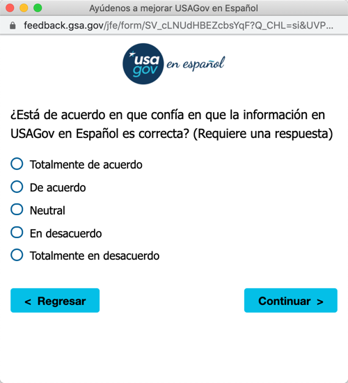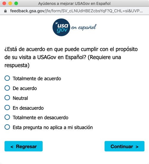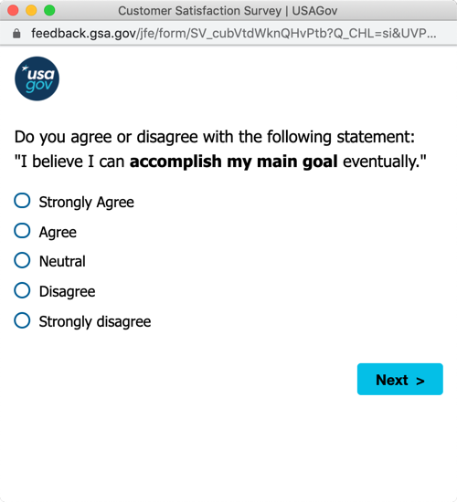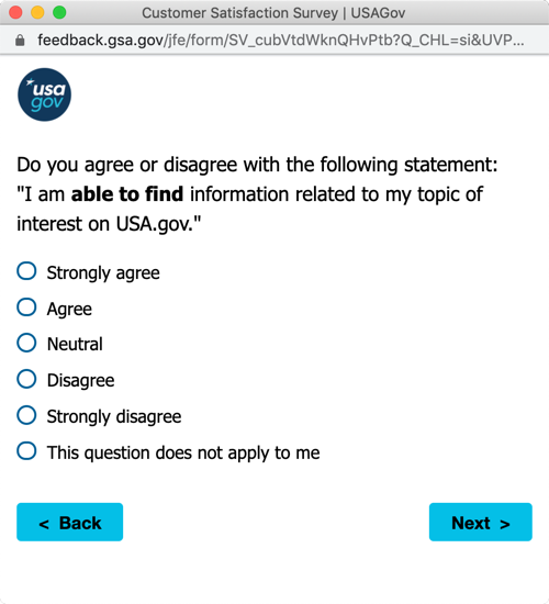 The message, “We are sorry to hear that you had a poor experience on USA.gov” only appears if the participant selects “Disagree” or “Strongly Disagree” for the first question about satisfaction on card 4.