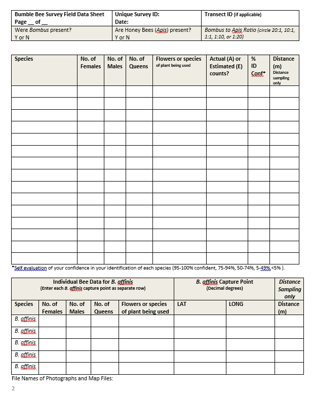 | Individual Bee Data: The data in this worksheet is for the collection of information on both federally listed and non-federally listed Bombus at the species level to understand the composition of the Bombus community in the survey area. The majority of fields in the “Individual Bee Data” tab are straight forward in terms of the information being requested. You may group individuals of one species in a row (for example, you can enter 25 female B. impatiens and 5 B. impatiens males in the same row), however, you could alternatively enter individuals in separate rows (for instance, if you wanted to note separate floral use for individual bee(s)). We are requiring unique capture points for federally listed species to be entered separately. If you observe more than one federally listed species at the same point location (roughly, within 25ft of each other), you may enter them together in one row. If you conducted activities, such as DNA collection, pollen collection, tagging, pathogen sampling or used B. affinis for training detection animals, please indicate those activities in the appropriate fields and separate by rows to correctly capture the numbers for each activity without duplicating counts. If using distance sampling, indicate the distance from the transect. | ||||||||