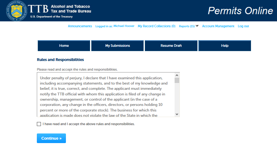 On the screen shown above, a new Alcohol Fuel Producer Permit applicant will select “Apply for new permits, registrations or notices.” Users will then see the following PONL Rules and Responsibilities page.