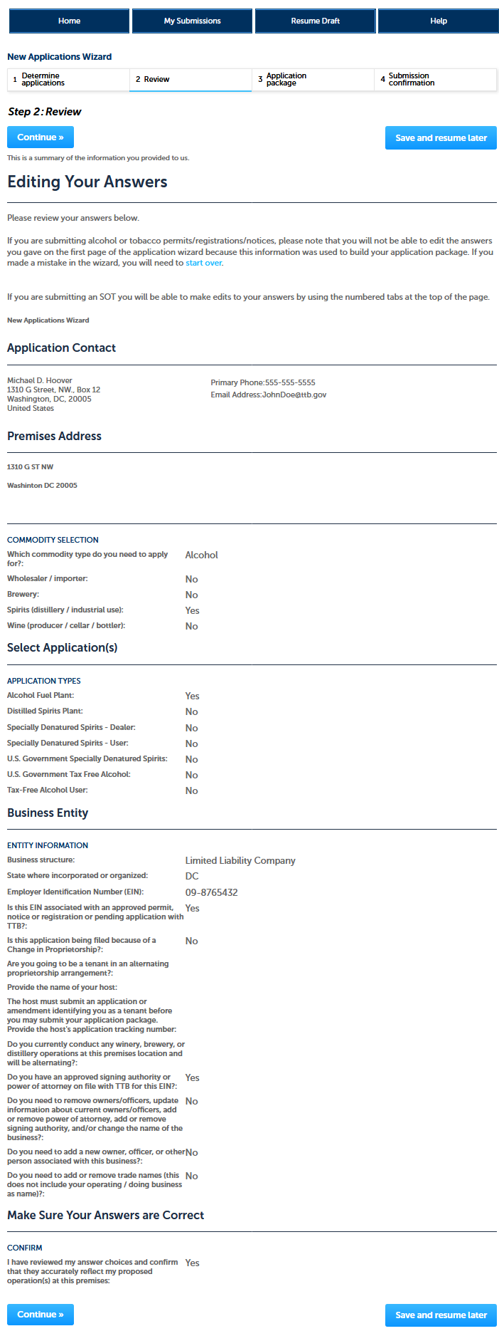 After clicking “Continue,” the user then will see a Review screen summarizing the data entered in Step 1, as shown on the following page.