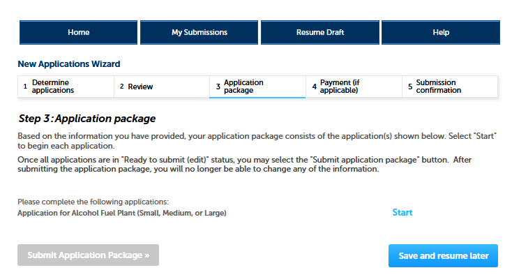 In Step 3, the user see a screen showing the type of applications they must complete, based on the information provided on the earlier screens. In this case, the user must complete the “Application for Alcohol Fuel Plant (Small, Medium, or Large)” as shown on this screen.