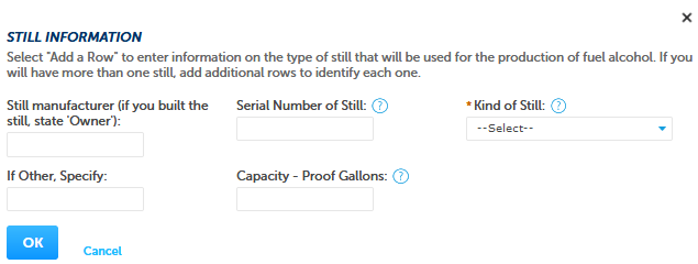 Clicking on “Add a Row” allows the user to enter information regarding their stills via this screen: