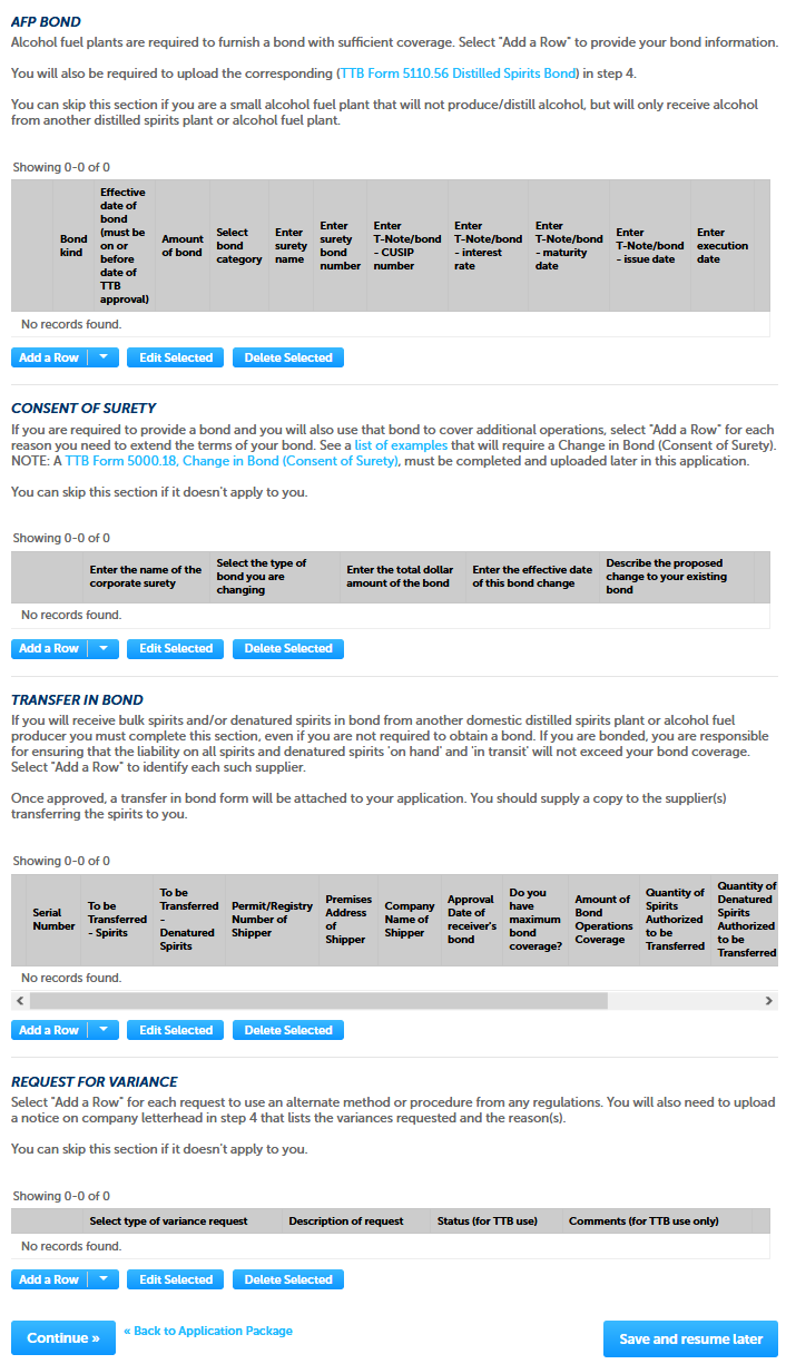 If the applicant must file a bond, the user completes the AFP Bond section and will also later upload form TTB F 5110.56, Distilled Spirits Bond. This collection is approved under OMB No. 1513–0125. See “Add a Row” screen shot on next page.