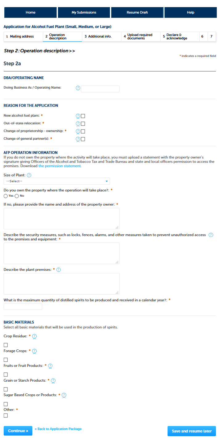 Application for Alcohol Fuel Plant (Small, Medium, or Large), Step 2 – Operation description: