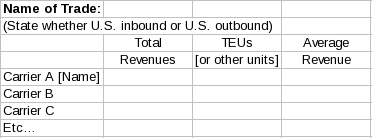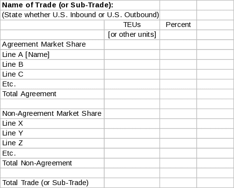 The applicable data for each agreement party may be entered directly into the Worksheet cells in the prescribed format. Alternatively, for convenience, data or Worksheets from external Excel files may be copied or imported into the Worksheet tables contained in this form. Please ensure that the format of the data in any external Excel files fully complies with the required format prescribed in appendix B of 46 CFR part 535. For technical assistance on copying or importing Excel files, please refer to Microsoft Excel Help.