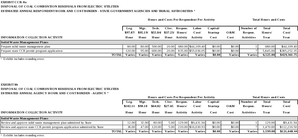Exhibit 8b summarizes the total annual Agency hour or cost burden associated with reviewing and approving State SWMPs and CCR permit program applications. As shown in the exhibit, EPA estimates the annual Agency burden to be 1,599 hours and $121,648.