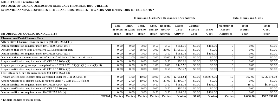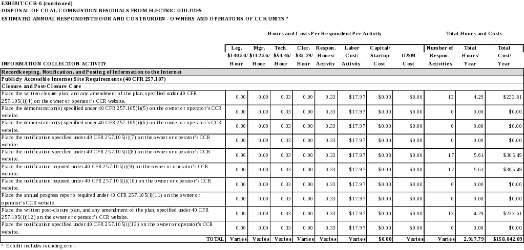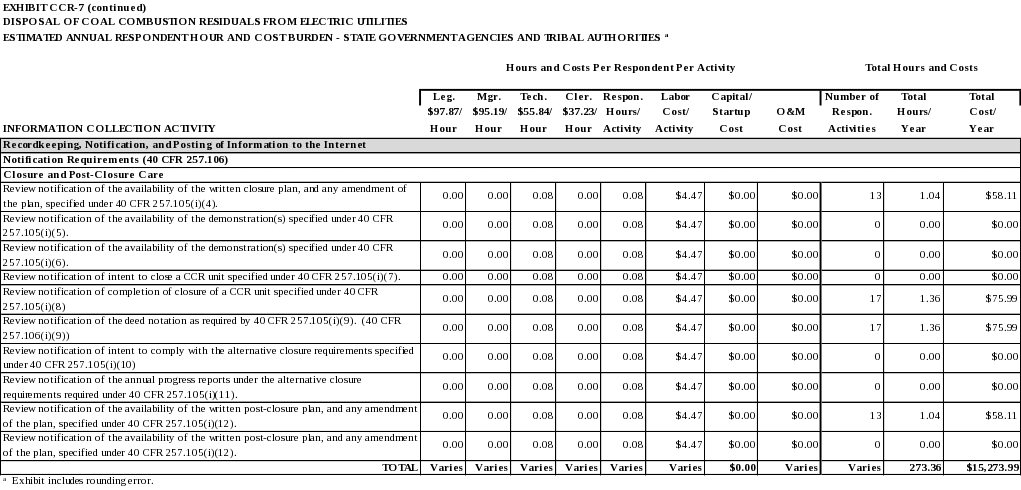 35 According to the data collected on postings made to publicly-accessible internet sites required by the 2015 CCR final rule (“CCR compliance websites”) required under 40 CFR 257, 126 CCR management units have already posted notices of intent (“NOIs”) to close. Because there have been more such notices of intent posted, posted than the number of anticipated annual closures (74), EPA assumes that no additional NOIs will be posted during this ICR.