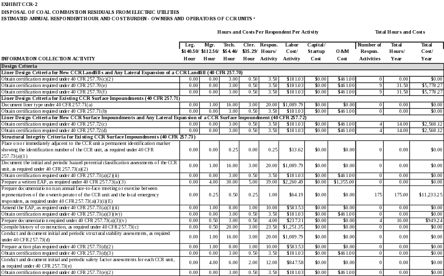 EPA assumes that owners and operators of all 122 new CCR units will document and include in the operating record the design, installation, development, and decommissioning of any monitoring wells, piezometers and other measurement, sampling, and analytical devices. EPA assumes that existing units have already completed this requirement. Owners and operators of these units also will obtain a certification from a qualified professional engineer stating that the groundwater monitoring system has been designed and constructed to meet the requirements of 40 CFR 257.91. EPA also assumes that these activities will be conducted once during the three-year life of the ICR. In estimating the annual respondent hour and cost burden over the three-year period covered by this ICR, EPA annualized the hour and cost burden of these one-time activities by dividing the number of CCR units by three. Thus, EPA estimates that 41 units (i.e., 122 units / 3 years), on average, will be subject to these requirements each year.