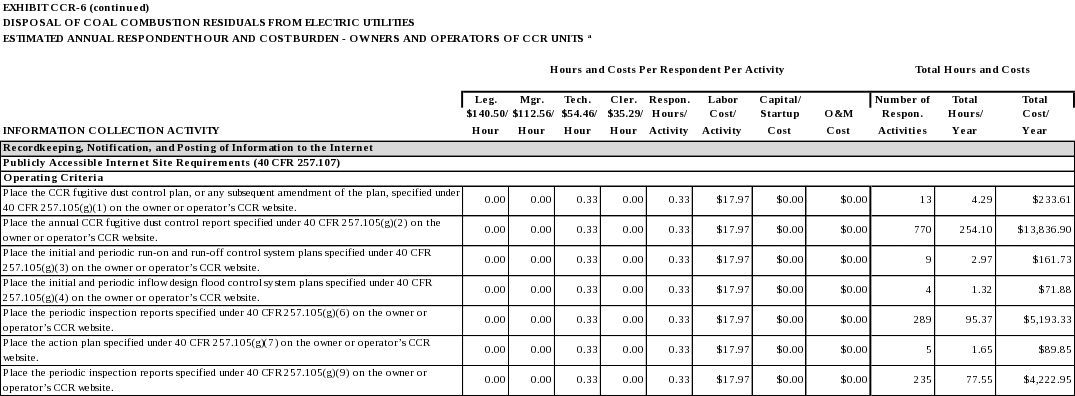 In Sections 1 through 5 of this ICR, EPA presents a comprehensive description of the 40 CFR Part 257 information collection requirements related to the disposal of CCR. In Section 6, EPA estimates the total annual burden and cost to respondents and the government associated with these paperwork requirements.