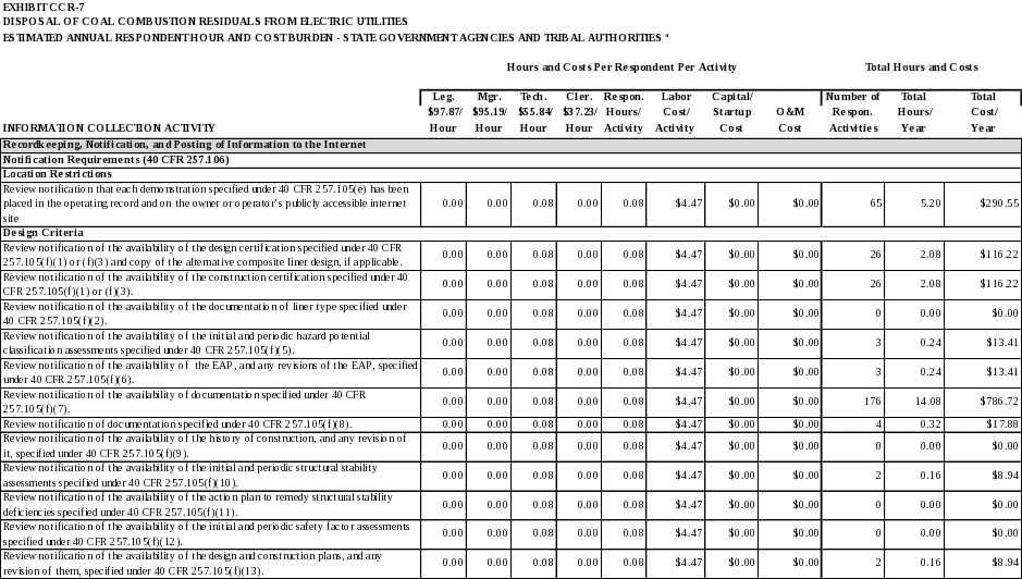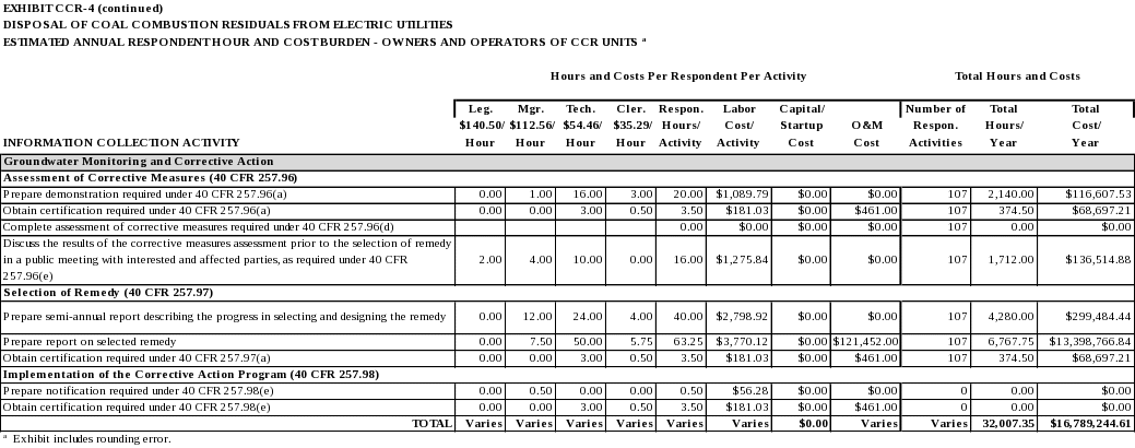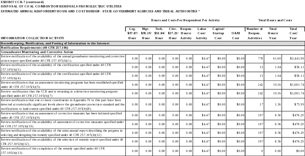 EPA assumes that, during the three-year period covered by this ICR, the concentrations of all constituents listed in Appendix IV will be shown to be at or below background values for two consecutive sampling events for 5 percent of the CCR units (i.e., 638 units x 0.05 = 32 units). EPA further assumes that these owners and operators will prepare a notification stating that detection monitoring is resuming for the CCR unit (40 CFR 257.95(e)). In estimating the annual respondent hour and cost burden over the three-year period covered by this ICR, EPA annualized the hour and cost burden of this one-time activity by dividing the number of CCR units by three. Thus, EPA estimates that 11 units (i.e., 32 units / 3 years), on average, will be subject to this requirement each year. EPA assumes that, during the three-year period covered by this ICR, one or more constituents in Appendix IV will be detected at statistically significant levels above the groundwater protection standard established under 40 CFR 257.95(h) for 5 percent of the CCR units (i.e., 638 units x 0.05 = 32 units). These owners and operators will need to prepare a notification identifying the constituents in Appendix IV that have exceeded the groundwater protection standard (40 CFR 257.95(g)). In estimating the annual respondent hour and cost burden over the three-year period covered by this ICR, EPA annualized the hour and cost burden of these one-time activities by dividing the number of CCR units by three. Thus, EPA estimates that 11 units (i.e., 32 units / 3 years), on average, will be subject to this requirement each year.