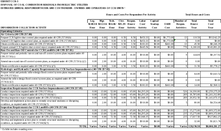 The burden increased significantly from the previous ICR mainly due to the fact that EPA merged the burden associated with the information collection requirements related to the disposal of CCR from existing ICR 2050-0053 to this ICR. The annual respondent burden in this current ICR is estimated to be 173,083 hours, which is an increase of 170,904 hours from the previously finalized/approved ICR of 2,179 hours. The annual cost burden in this current ICR is estimated to be $15,511,426, which is an increase of $14,726,102 from the previously finalized/approved ICR of $785,324.