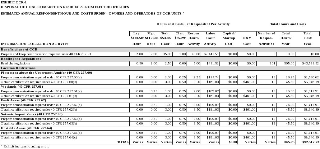 EPA assumes that owners and operators of all 122 new CCR units will develop a sampling and analysis program. EPA also assumes that owners and operators of these units will obtain a certification from a qualified professional engineer stating that the selected statistical method is appropriate for evaluating the groundwater monitoring data for the CCR management area. EPA further assumes that these activities will be conducted once during the three-year life of the ICR. In estimating the annual respondent hour and cost burden over the three-year period covered by this ICR, EPA annualized the hour and cost burden of this one-time activity by dividing the number of CCR units by three. Thus, EPA estimates that 41 units (i.e., 122 units / 3 years), on average, will be subject to this requirement each year.