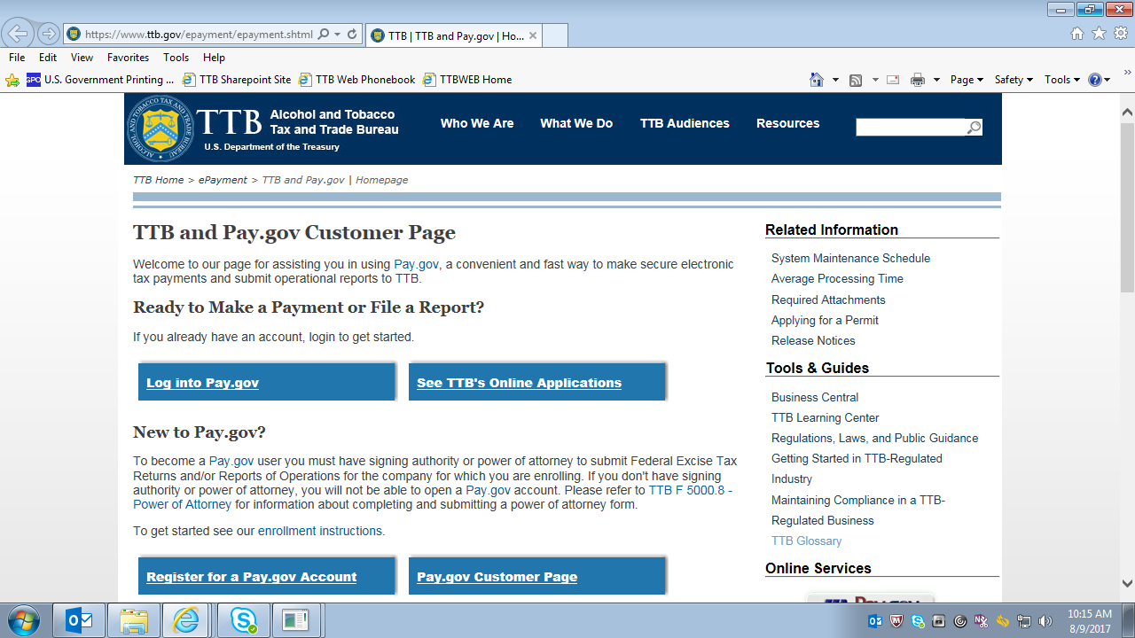 Clicking on the Pay.gov link in this Tutorial takes the user to the Pay.gov introductory page on the TTB website at https://www.ttb.gov/epayment/epayment.shtml, which is shown below: