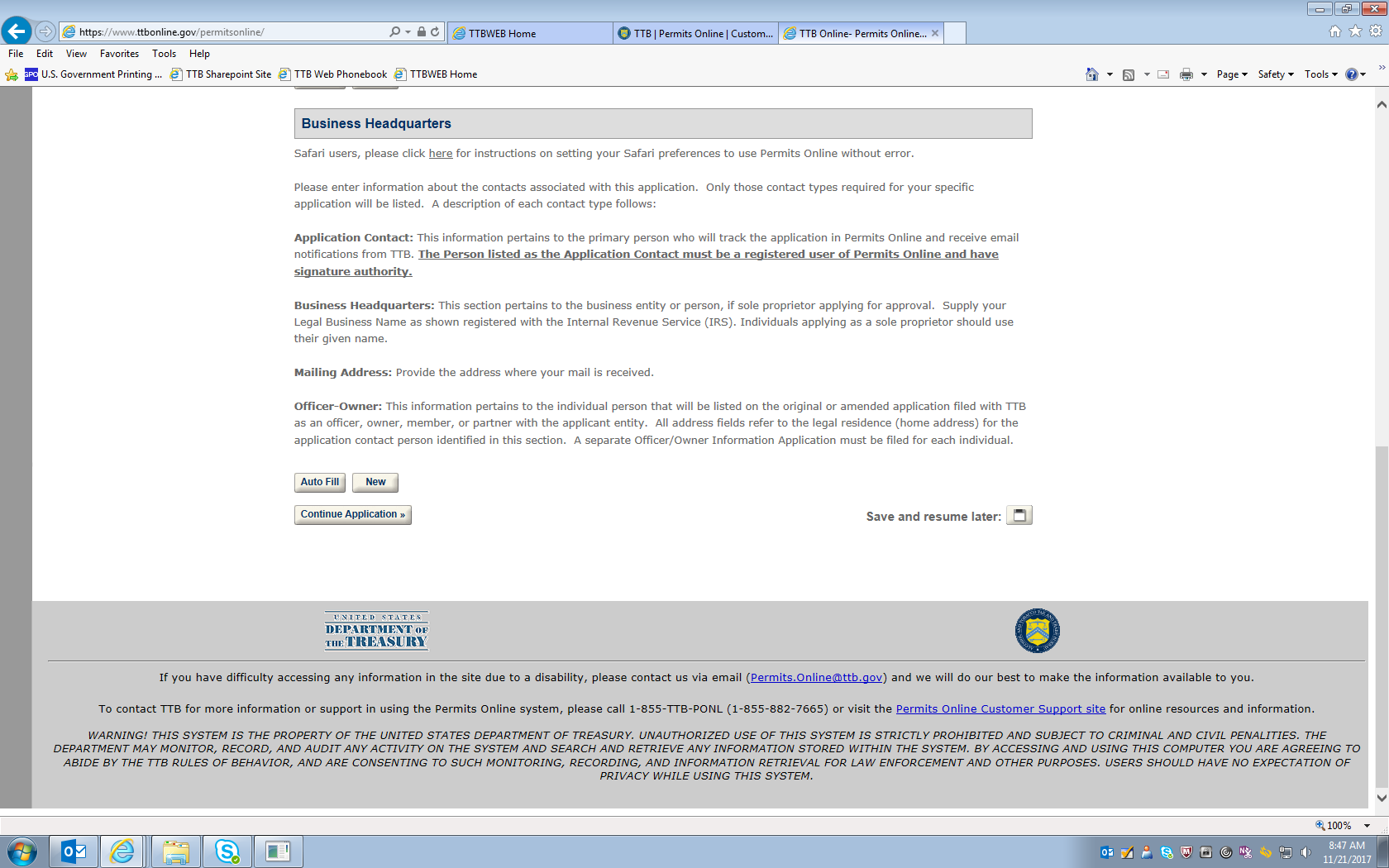[The screens that follow allow the user to review the submitted information and then submit the completed application to TTB.]