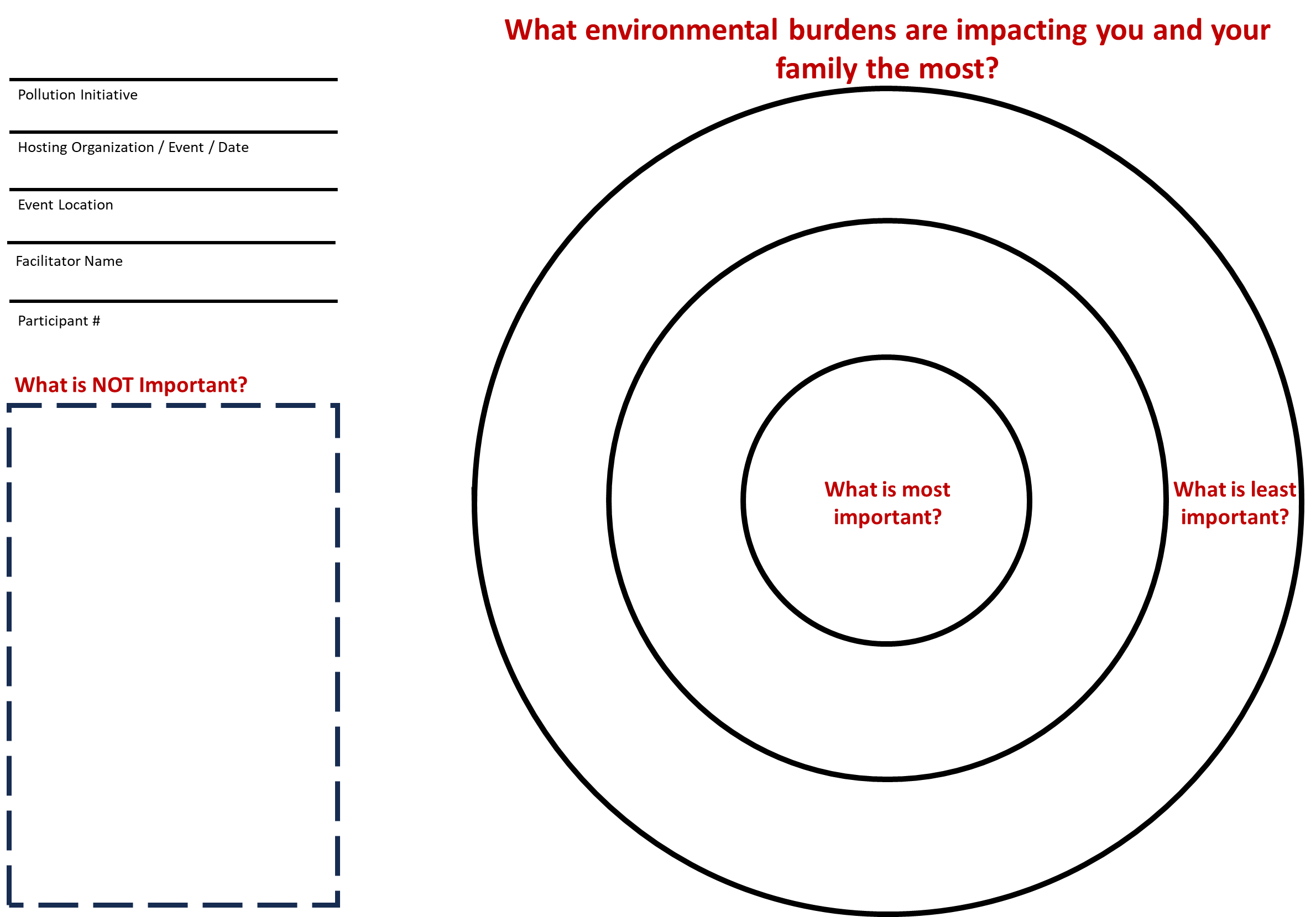 On your tables you will see an activity (Figure) to gain feedback about what environmental burdens you are most impacted by. This open-ended activity is meant to be fun and creative so you can tell your stories and help us co-plan potential programs. On your tables, you will see one piece of paper with a bullseye and a set of stickers. At the top of the bullseye sheet you will see the question “What environmental burdens are impacting you and your family the most?” Feel free to use the stickers however you would like putting the most important things in the center and lesser important things in the outer rings or in the dashed box. You may use as many or as little stickers as you want. If something isn’t on there that you think is important, please use the blank stickers to write it in. After you are done we will go around the table for each of you to tell your stories! Feel free to ask us if you have any questions. Remember when telling your stories do not use any identifying information.