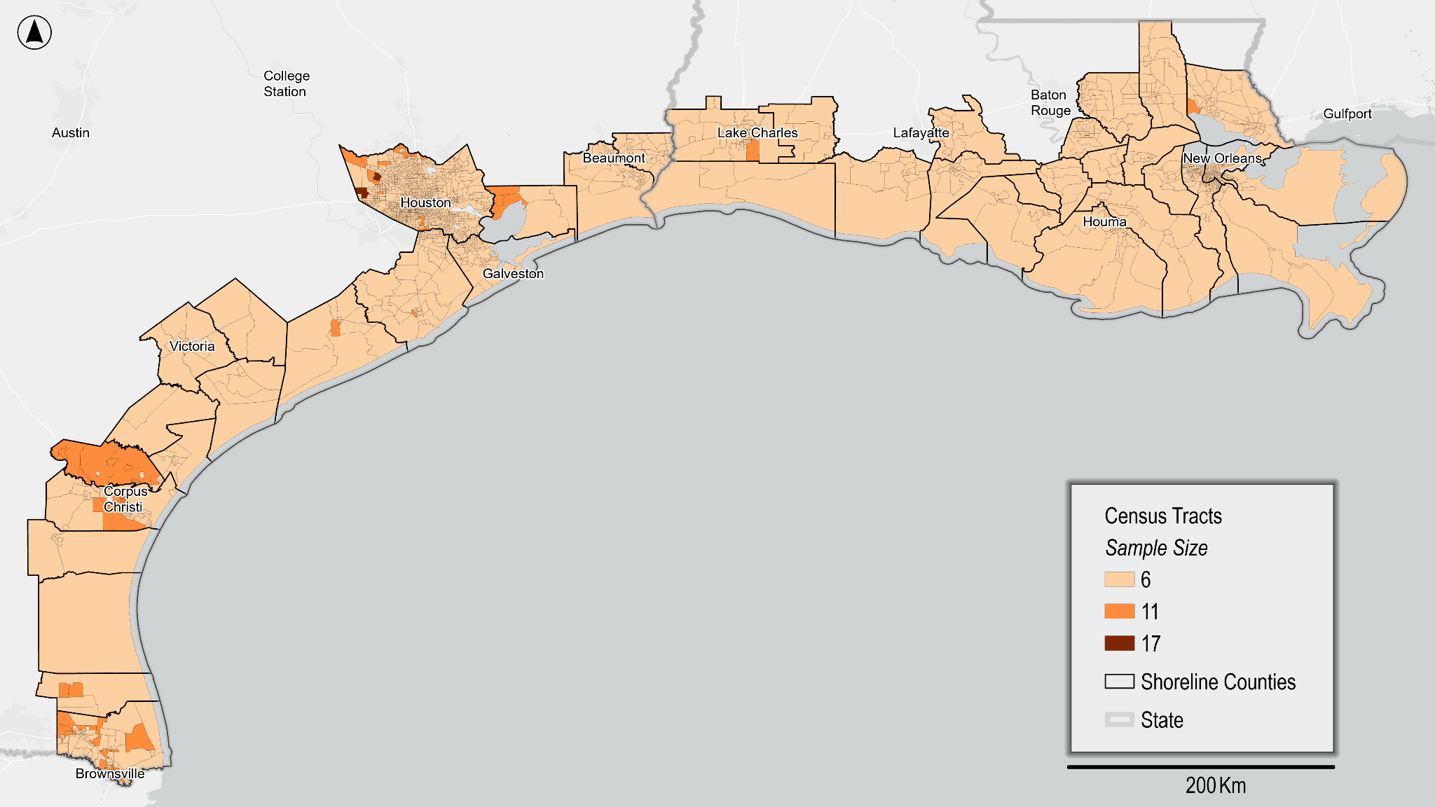 Figure 1: Final sample size per Census tract across shoreline counties in Texas and Louisiana.