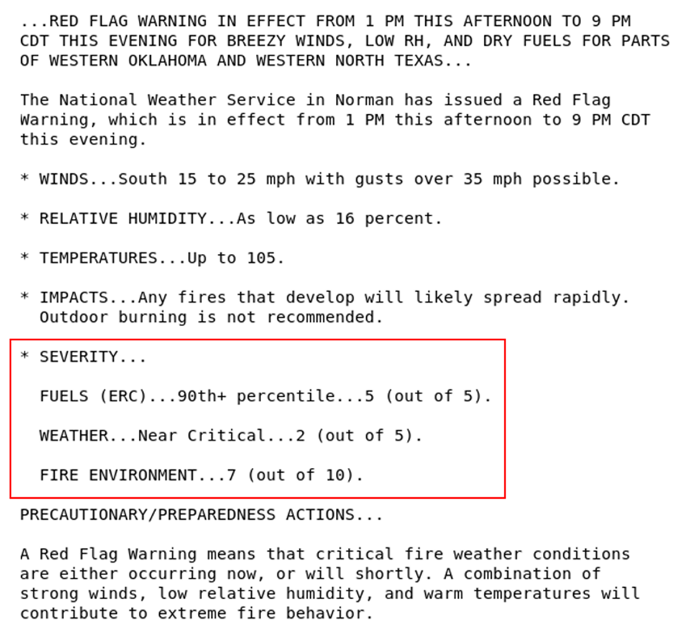 Finally, we have a Red Flag warning with some probabilistic information added. The information within the red square is added probabilistic information is not information you would usually see in a Red Flag warning. Again, take a minute to look at this information.