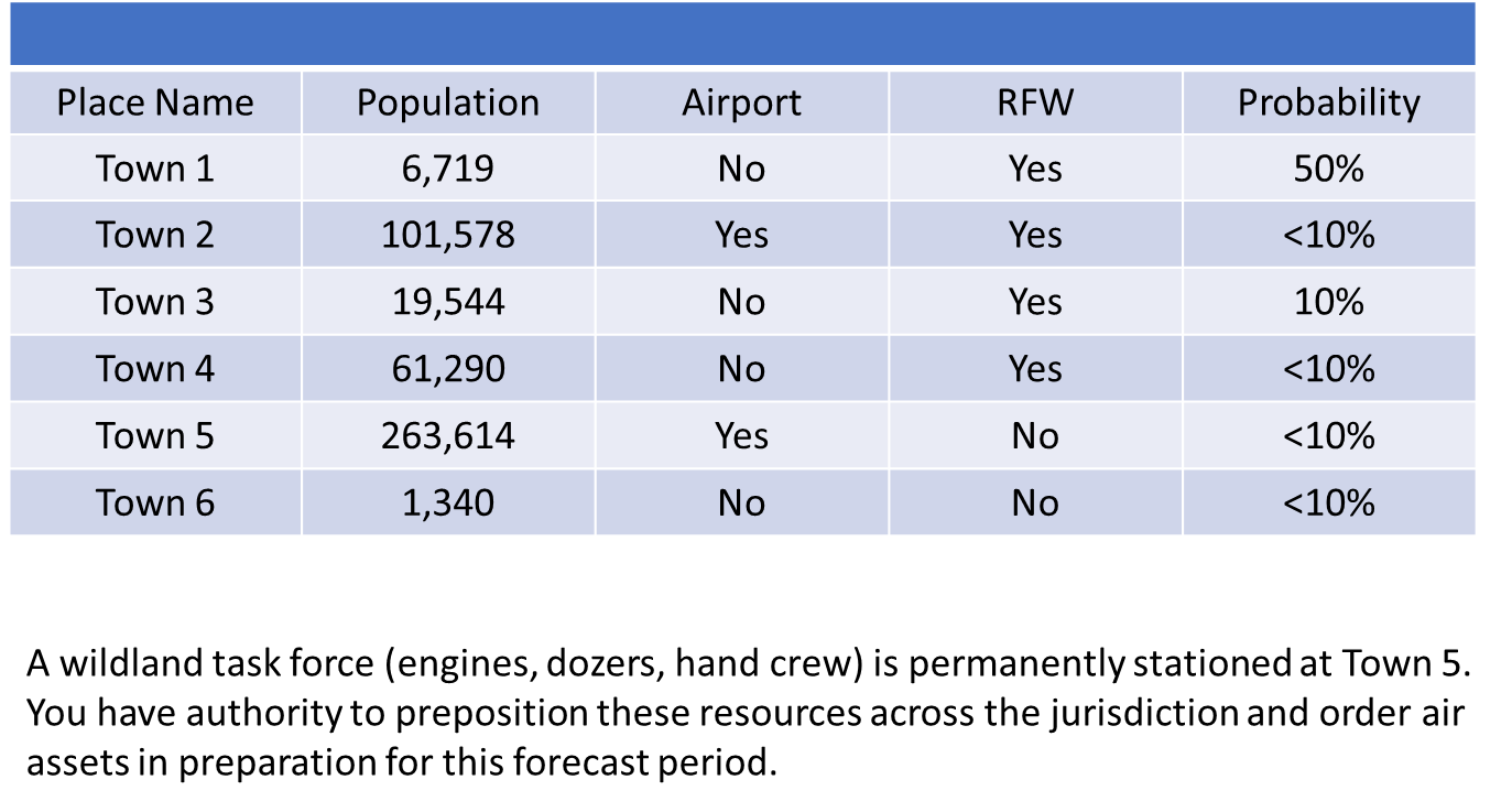 How about weather-related decisions about response to wildland fire? Probe: Think about decisions related to allocation of resources (staffing, resources, materials), communication with partners and audience, etc.