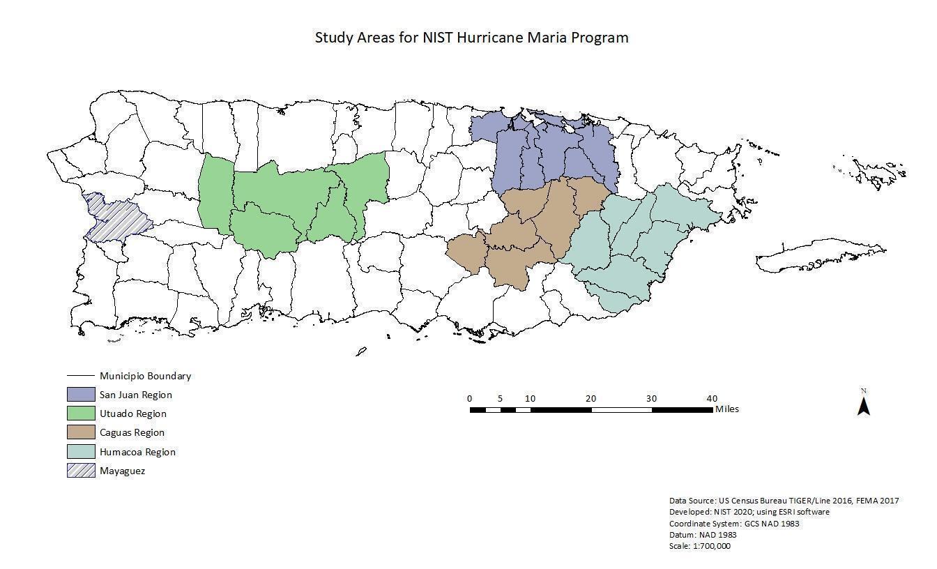 NIST has selected four regions of Puerto Rico for particular focus, in light of the geographic and socio-economic diversity of these regions, the path of the storm, and the variety of Hurricane Maria’s hazards and impacts in these regions (i.e., rainfall and flooding, landslides, wind damage, and impacts to hospitals). Four regions (San Juan, Caguas, Humacao, and Utuado) were selected as the study area, as well as the municipality of Mayagüez which has been added as an additional area of study so as to align with the goals and objectives of the investigation. The initial basis for the selection of these regions was the 2017 map of emergency management zones, which was in effect at the time of Hurricane Maria. The hospital sample is in effect a census of hospitals in the study area. In other words, the sample represents 100% of the population of hospitals in the study area. Because of the limited number of hospitals in the study area, the data collection and subsequent analysis may include organizations outside of the study area.