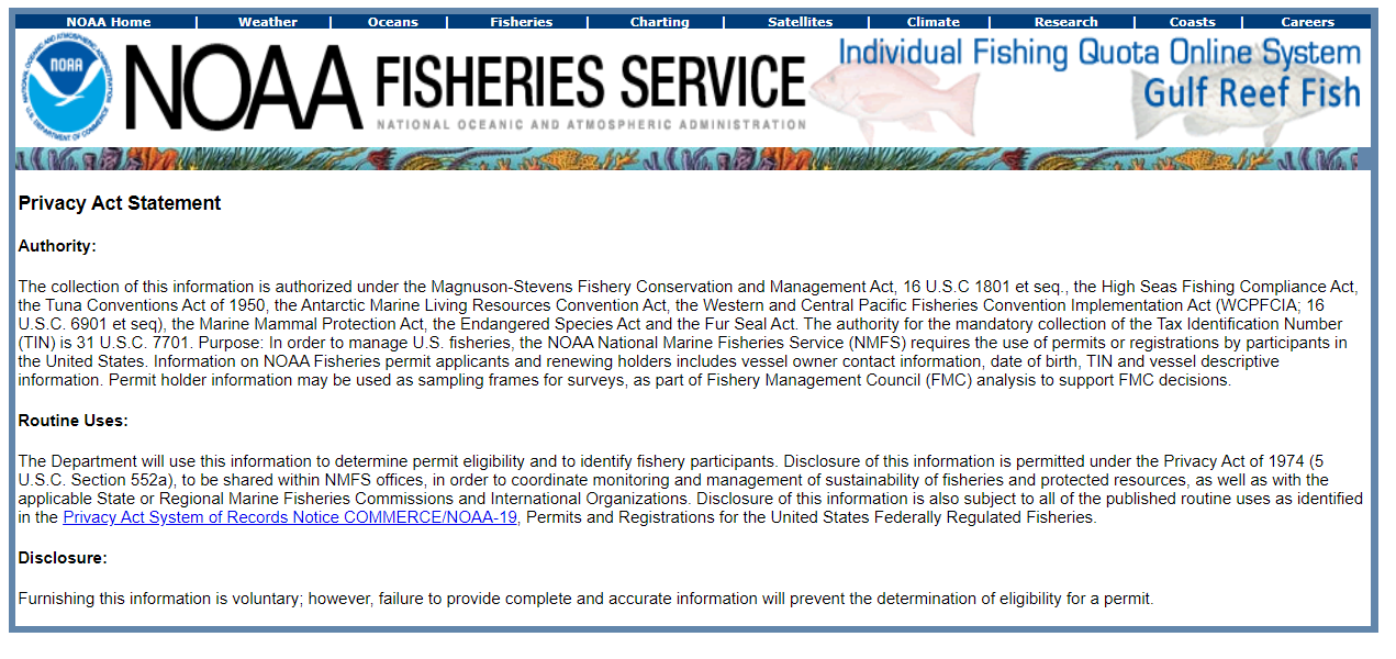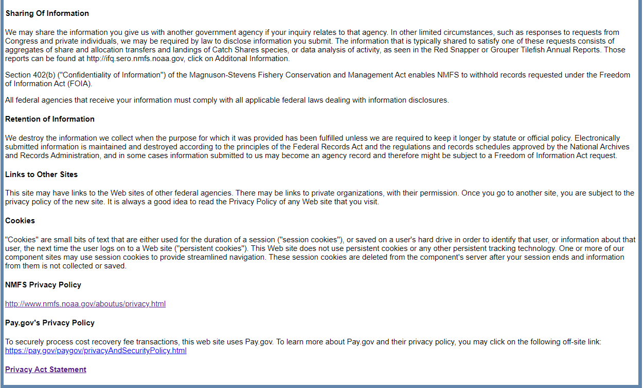 Privacy Act Statement (link to https://portal.southeast.fisheries.noaa.gov/cs/ifq_pas.html)