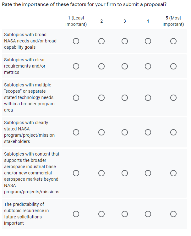 The purpose of this Request for Information is to engage industry and small businesses early on to build awareness, gain insights, and obtain feedback to shape the Program Year (PY) 22 NASA SBIR/STTR Solicitation and identify process improvements to elevate the customer experience.