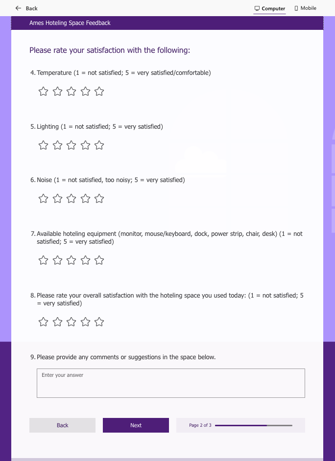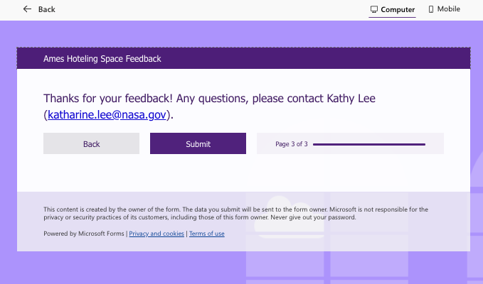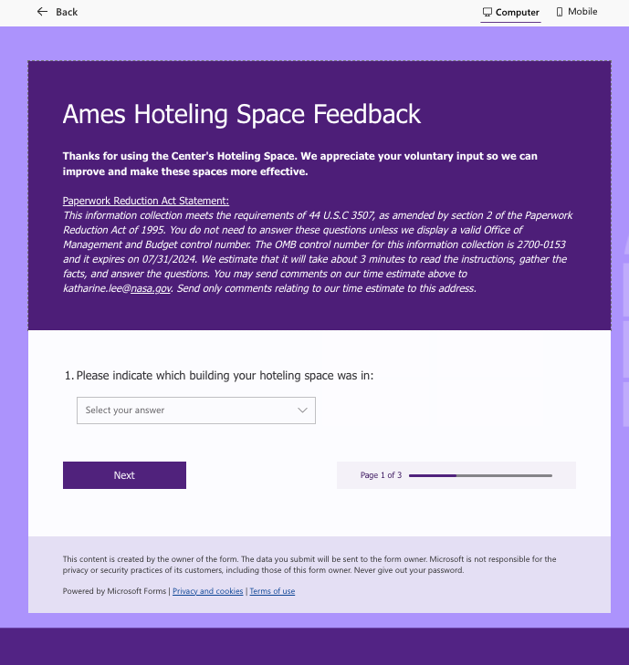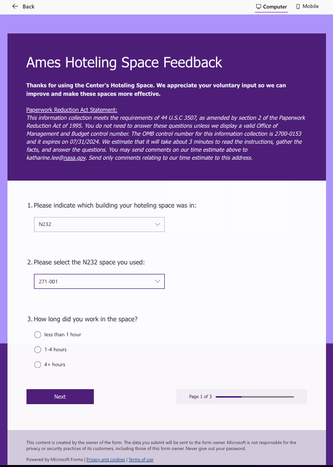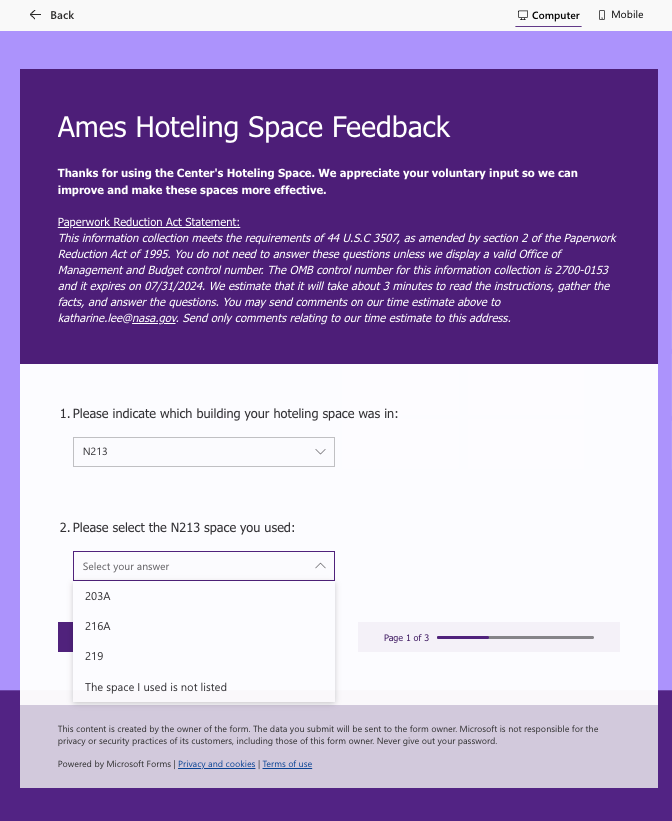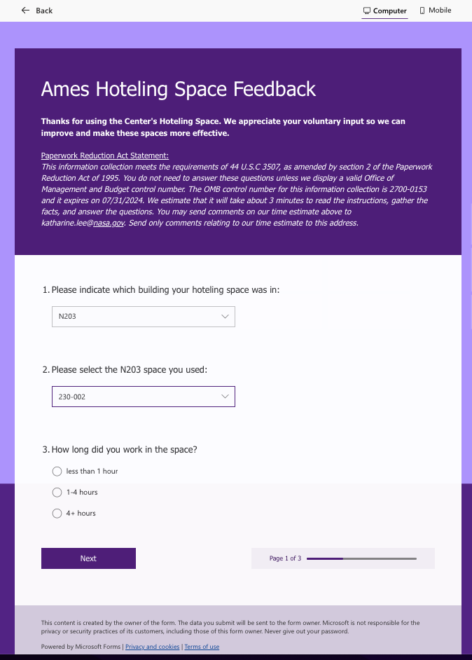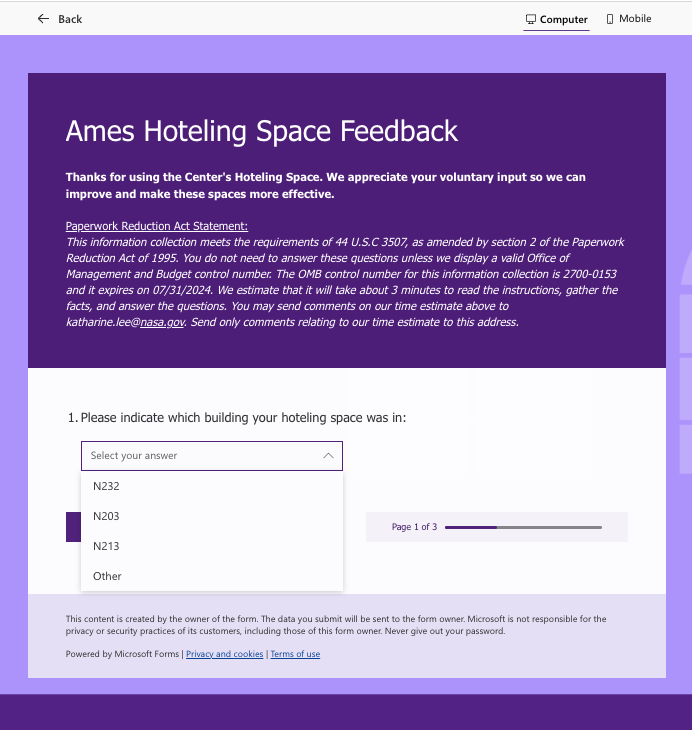 NASA Ames Hoteling Space Feedback - Screenshots