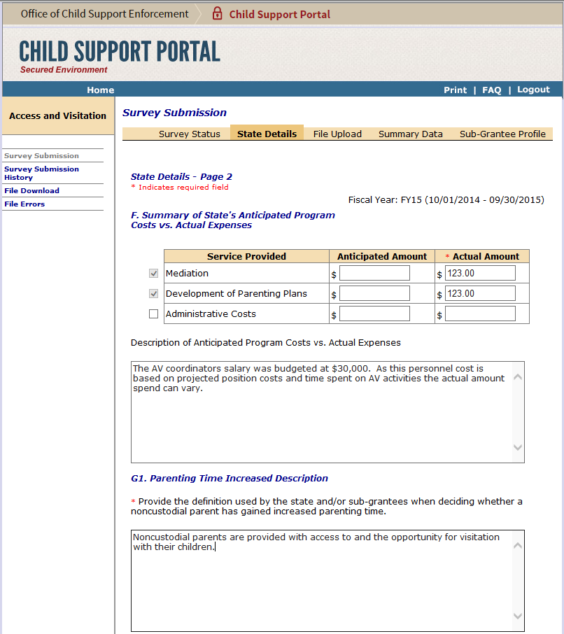 PAPERWORK REDUCTION ACT OF 1995 (Pub. L. 104-13) STATEMENT OF PUBLIC BURDEN: Through this information collection, ACF is gathering information to collect FY 2024 program data using the current form, and enable OCSS to provide training to states and local grantees on the changes made to the proposed revised survey for years beginning in FY 2025. The purpose of this information collection is to ensure grantees are adhering to the statutory (Sec. 469B. [42 U.S.C. 669b] and regulatory (45 CFR Part 303) requirements for recipients of “Grants to States for Access and Visitation” The survey captures all required data points as specified in federal statute and regulation.
