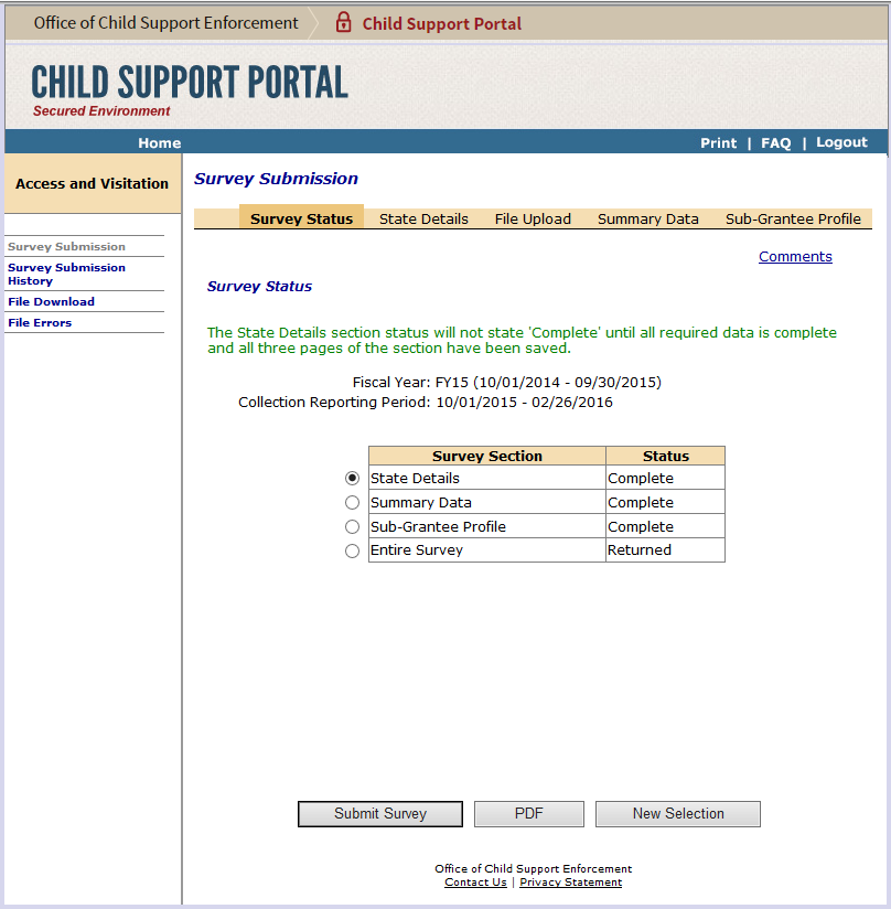 Note: When a survey is returned, all survey sections revert to ‘Incomplete’. In order to resubmit the survey, the State Details pages need to be ‘Saved’ again, AND the Summary Data and Sub-Grantee Profile pages also need to be ‘Verified’ again.