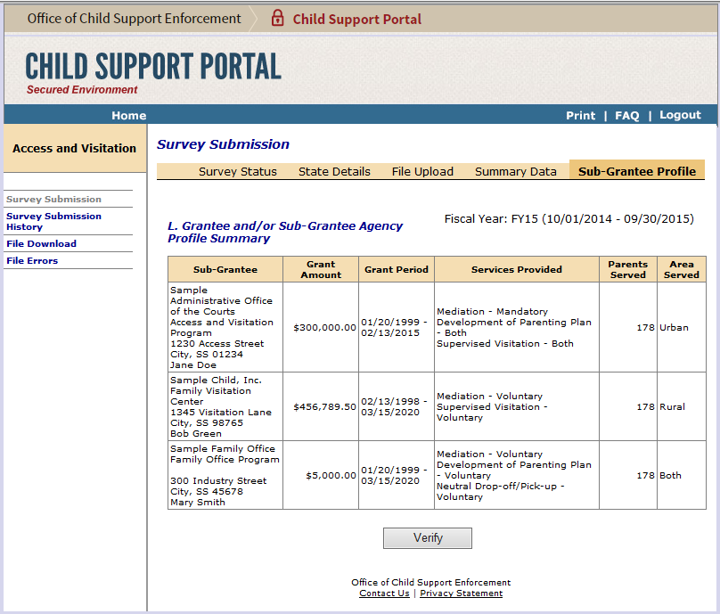 If you make revisions to the State Excel Spreadsheet, make sure its content will pass all data checks before uploading the revised file (see Section 4. System Validation). Upload the revised file (see Section 5. Uploading the File) and wait for the email confirmation indicating the status of file processing. The system generates an e-mail within 5 minutes to indicate whether the file processed successfully. If the e-mail message indicates that the state spreadsheet processed successfully, the next step in the reporting process is validation of the Summary Data and Sub-Grantee Profile Sections. Validate the Summary Data and Sub-Grantee Profile Sections by selecting Verify at the bottom of both pages. Once the status of the Summary Data and Sub-Grantee Profile Sections on the Survey Status page state “complete”, you will be prompted to resubmit to OCSS.