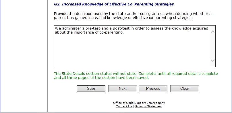 This field corresponds with field G2 of the State Details section. The definition of success provided in field G2 determines the values provided in Outcome #2- Knowledge of Effective Co-Parenting Strategies fields.