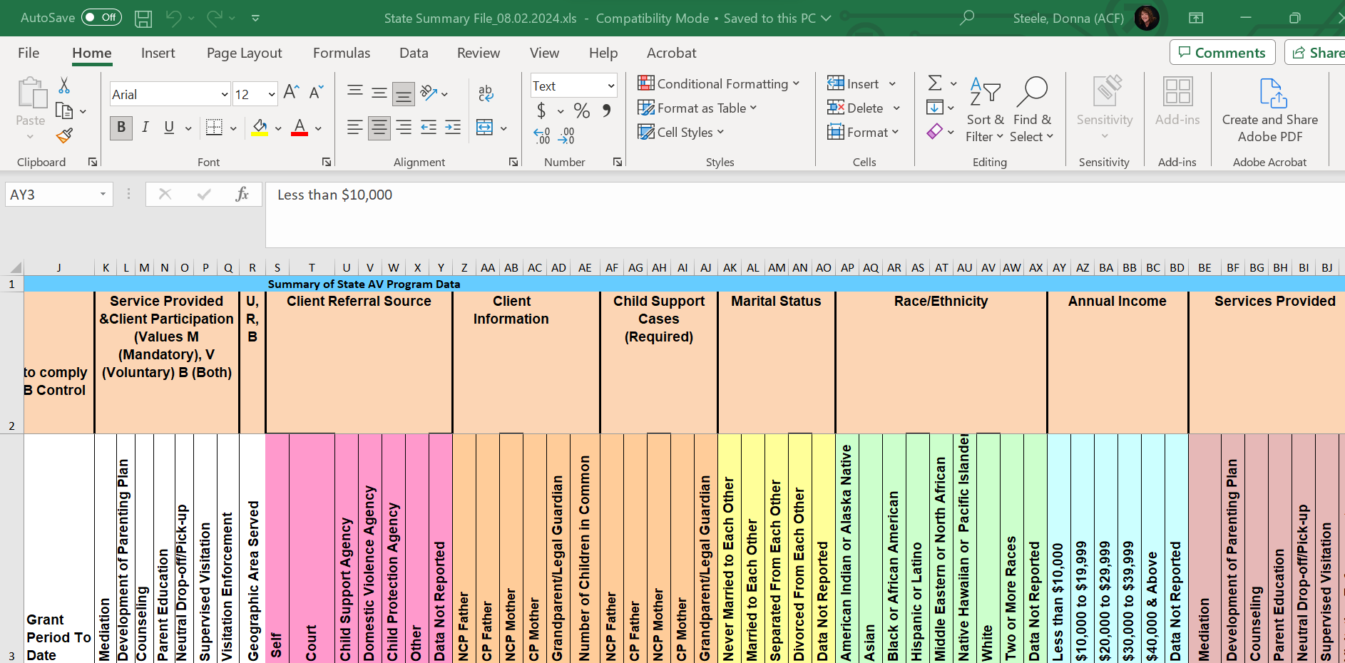 If multiple individuals are part of the same case/reference identifier, enter the various quantities in the Race/Ethnicity fields. The total for Race/Ethnicity should match the same total for Client Referral Source (S-Y), Client Information (Z-AD), and Annual Income (AY-BD).
