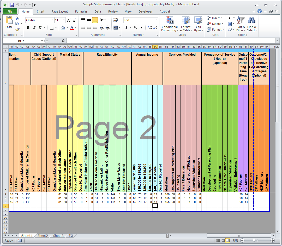 Figure 3-3 shows an example of the state spreadsheet (page 2) containing Annual Income (AY-BD), Service Provided (BE-BK), Frequency of Service (Hours) (Optional) (BL-BR), Outcome #1-Parenting Time (Required) (BS-BT), and Outcome #2 Knowledge of Effective Co-Parenting Strategies (Optional) (BU-BX).