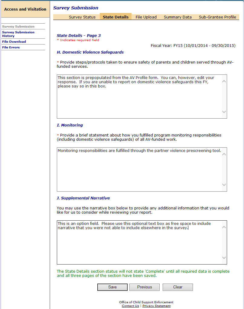 The State Details pages automatically pre-populate the most recent submitted content. In other words, text submitted in the previous year will pre-populate on the state details pages the following year. Edit pre-populated text as necessary. If you would like to empty all text boxes, select Clear at the bottom of the page.