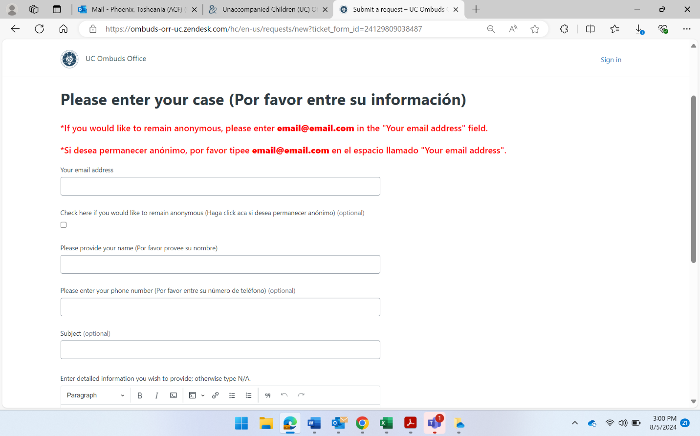 PAPERWORK REDUCTION ACT OF 1995 (Public Law 104-13) STATEMENT OF PUBLIC BURDEN: The purpose of this information collection is to allow individuals to voluntarily raise concerns about the Unaccompanied Children Bureau in the Office of Refugee Resettlement. Public reporting burden for this collection of information is estimated to average 30 minutes per respondent, including the time for reviewing instructions, gathering and maintaining the data needed, and reviewing the collection of information. This is a voluntary collection of information. An agency may not conduct or sponsor, and a person is not required to respond to, a collection of information subject to the requirements of the Paperwork Reduction Act of 1995, unless it displays a currently valid OMB control number. The OMB # is 0970-0531 and the expiration date is 9/30/2025. If you have any comments on this collection of information, please contact Leah Chavla at leah.chavla@acf.hhs.gov.