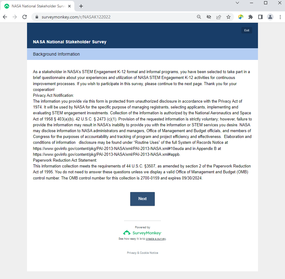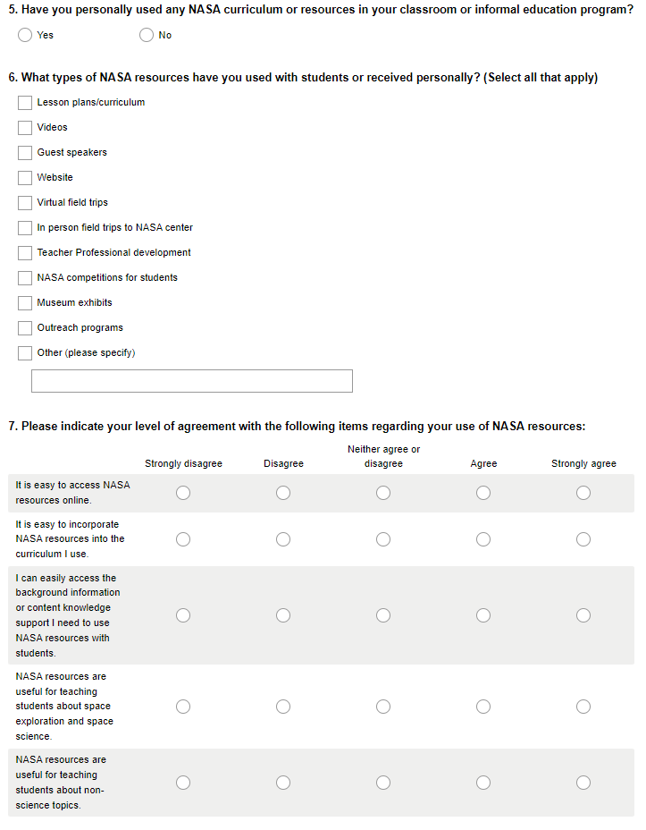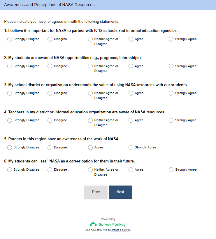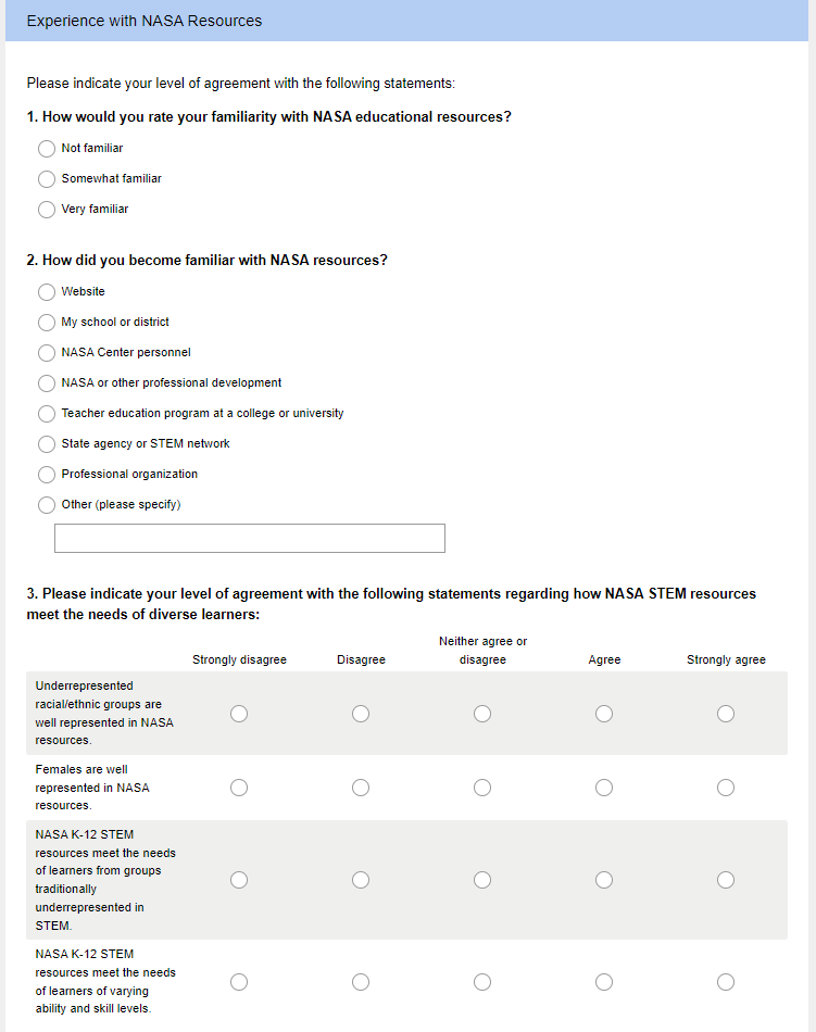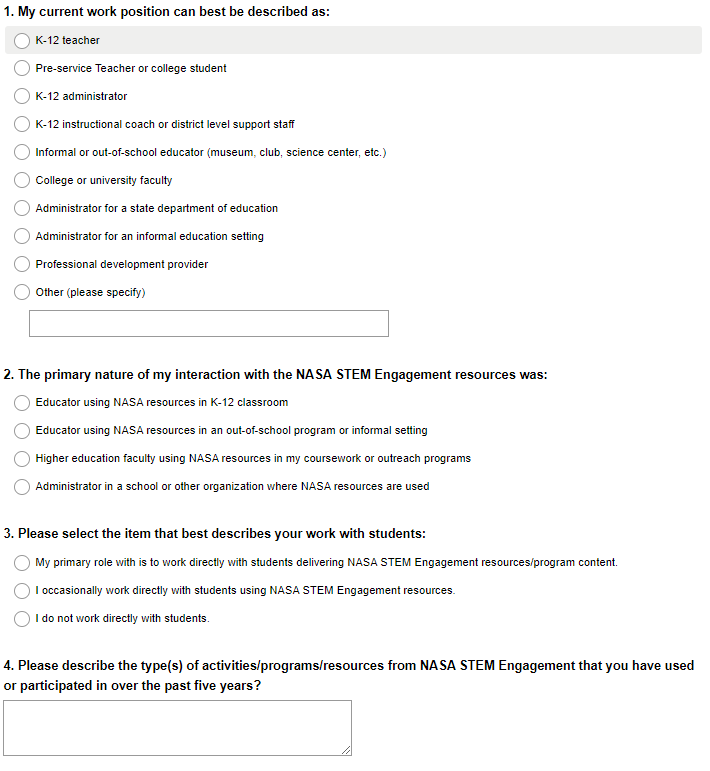 NASA National K-12 Stakeholder Survey Screenshots